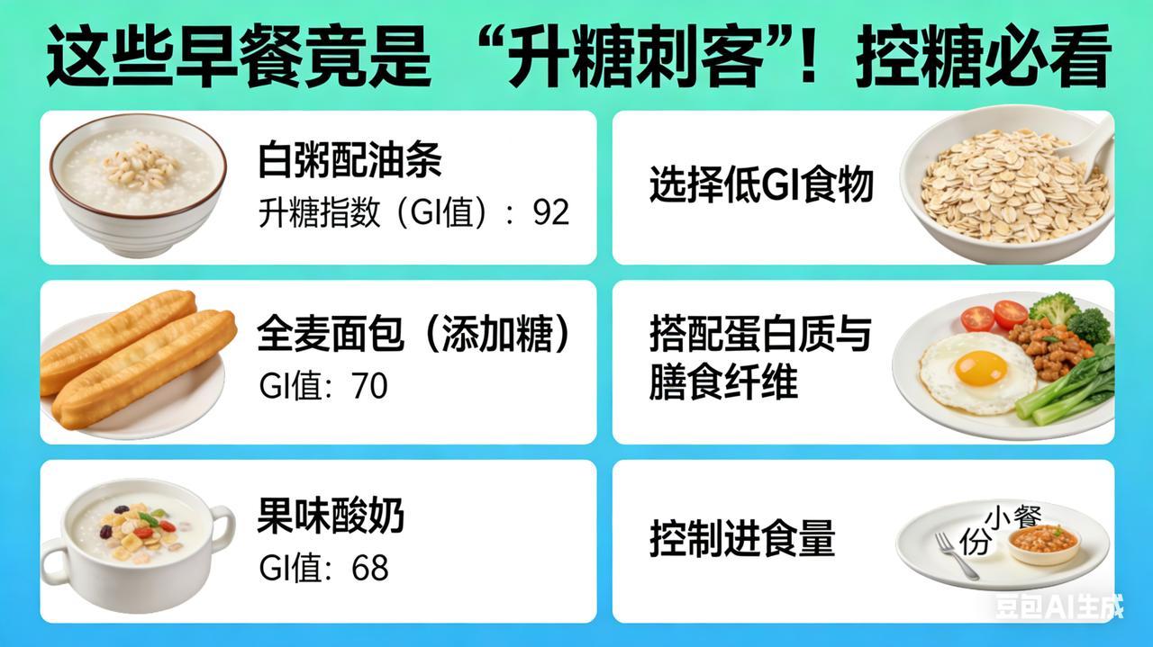 这些早餐竟是 “升糖刺客”!控糖必看 🚨【控糖地雷】被揪出的“升糖黑手”,竟是你天天吃的“温柔陷阱”!🚨 别再被“清淡养胃”忽悠了!你的早餐盘里,可能藏着让血糖坐“过山车”的顶级杀手。它们披着健康的外衣,实则是穿肠毒药,正悄悄把你的胰岛功能推向崩溃边缘! 头号元凶:熬到烂糊的白粥! 这不是养胃,是“灌糖”!大米长时间熬煮,淀粉彻底糊化,消化酶不费吹灰之力就能将其分解。喝下一碗,葡萄糖在15分钟内如洪水般涌入血液,血糖峰值比直接吃白糖还猛!那种饭后的昏沉感,不是放松,是高血糖引发的身体“宕机”。 隐形帮凶:西式点心与“假健康”果汁! 白面包、起酥蛋糕,升糖指数(GI)轻松破70。更可怕的是液体糖——奶茶、可乐,甚至是鲜榨果汁!去除了膳食纤维的果汁,就是纯粹的“果糖炸弹”,肝脏瞬间过载,直接转化为脂肪。 伪装者:土豆泥与糯叽叽主食! 土豆一旦捣成泥,细胞壁破碎,升糖指数从60飙升至87!还有糯米鸡、粘豆包,支链淀粉让血糖黏在高位下不来,上午十点必饿,陷入“越吃越馋”的死循环。 ✅救命指南: 1. 把“稀”换成“粗”:杂粮粥(保持颗粒感)、燕麦、荞麦面,GI值直降30%。 2. 死磕“吃顺序”:先吃两口菜,再吃肉,最后吃主食,血糖波动减少50%! 3. 加个“缓冲垫”:早餐必须有蛋或奶,蛋白质能像海绵一样吸附糖分,延缓吸收。 别让“养生早餐”变成“减寿早餐”!明天早上,把白粥换成杂豆饭,把油条换成煮鸡蛋,你的血糖会感谢你!转发到相亲相爱一家人,别让爱变成伤害!🚫🍞📉