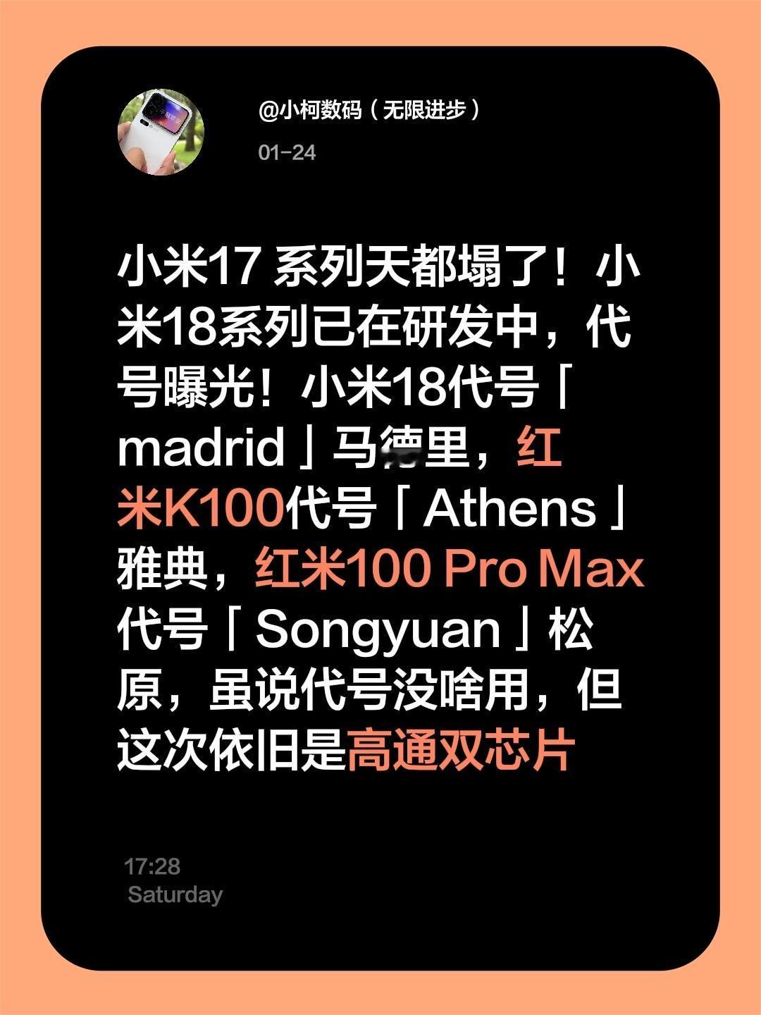 小米17 系列天都塌了!小米18系列已在研发中,代号曝光!小米18代号「madrid」马德里,红米K100代号「Athens」雅典,红米100 Pro Max代号「Songyuan」松原,虽说代号没啥用,但这次依旧是高通双芯片
