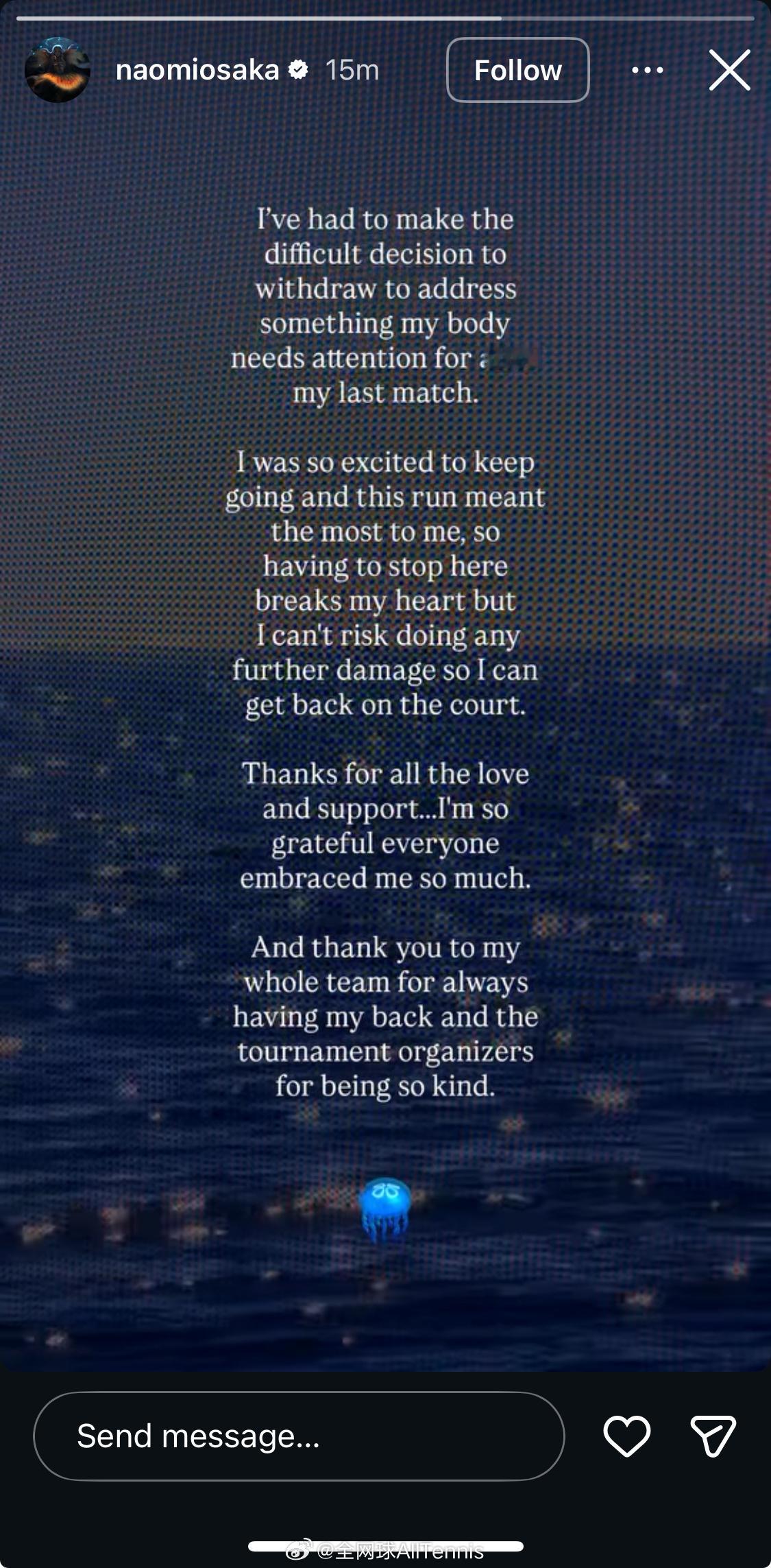 大坂直美宣布因伤退出本届澳网2026 ,她的对手、本土球员英格利斯直接晋级16强。“上一场比赛过后我的身体出现了一些情况,我很期待能继续比赛但我无法坚持,我不能冒着伤情加重的风险。非常感谢大家的支持和爱。”这很澳网大坂直美澳网因伤退赛