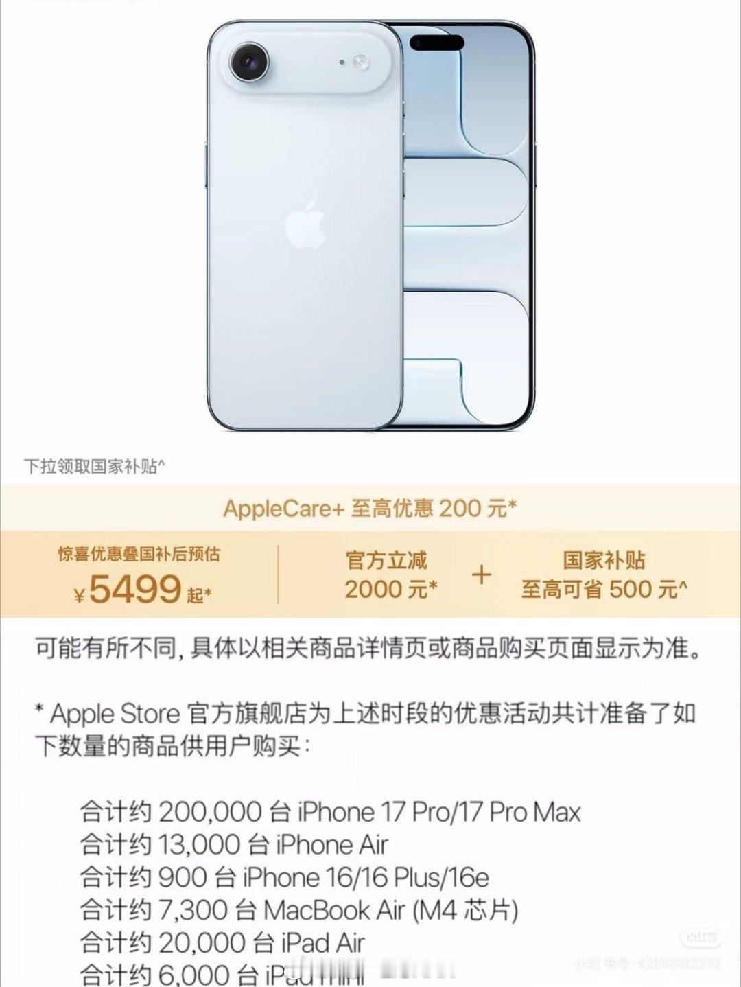看了一下,苹果这次力度也挺一般的,主要是数量太少…也就是iPhone Air还比较香,官方便宜2000,但是只有1.3万台,Pro和Max都只有300也没啥意思,随便找个渠道都便宜很多