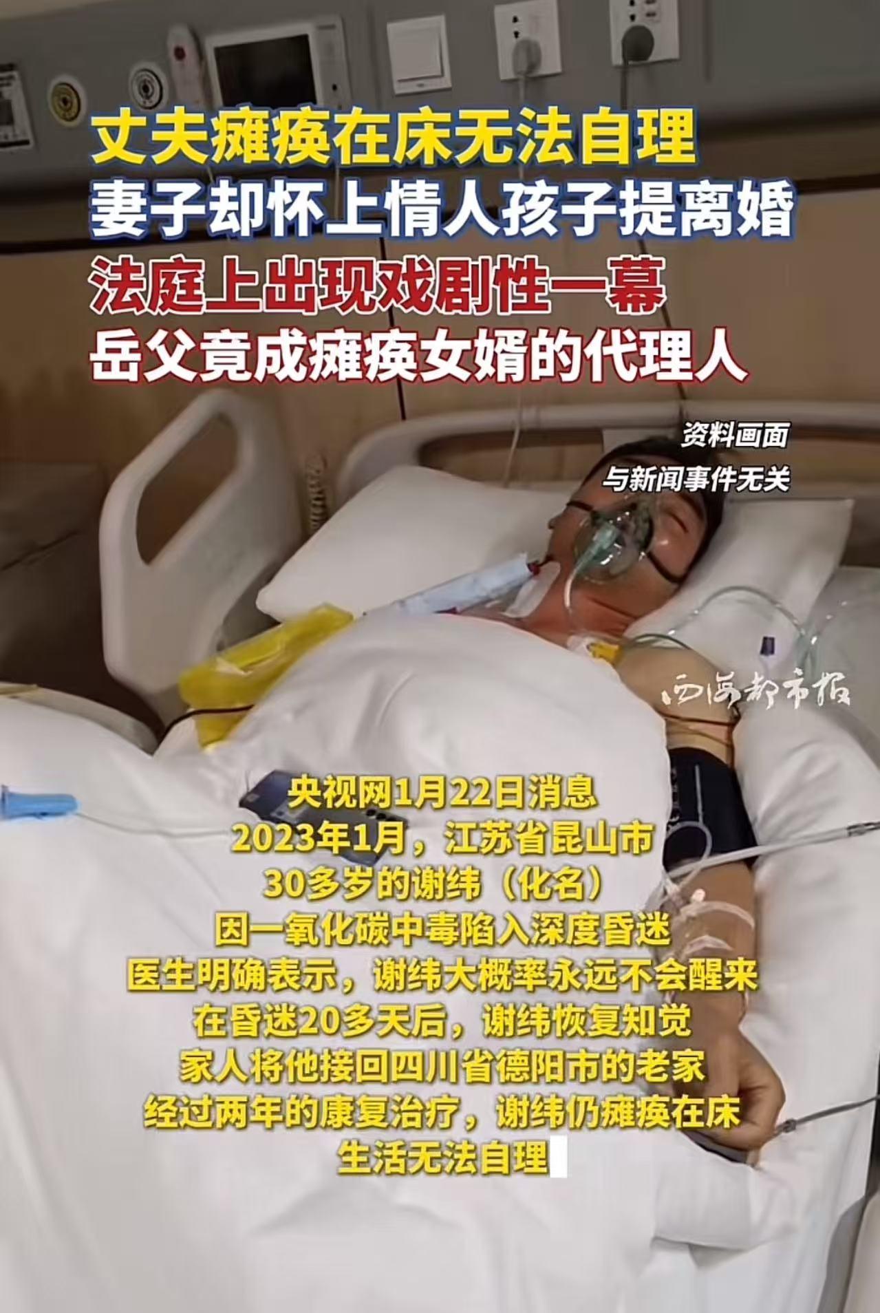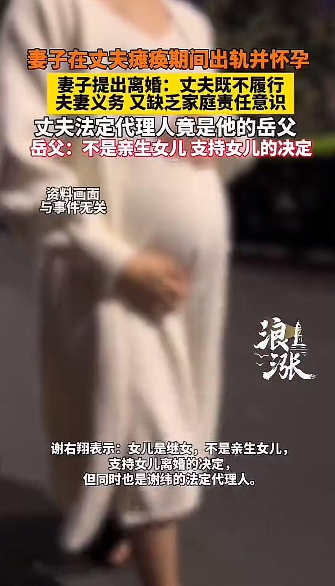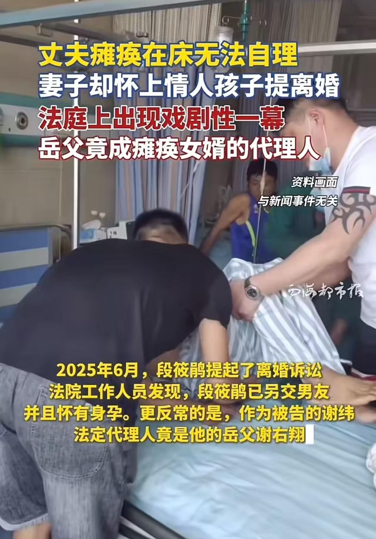 丈夫瘫痪在床无法自理,妻子却怀上情人孩子并提出离婚,法庭上出现戏剧性一幕:岳父竟成瘫痪女婿的代理人!网友怒斥:“丈夫瘫痪后,妻子有权提出离婚,但不能在离婚前出规怀孕,这样做违背民法良俗!” 2023年1月,江苏昆山。30多岁的谢纬(化名)因热水器故障,遭遇一氧化碳中毒,陷入深度昏迷。 医生一度下达病危通知:“苏醒可能性极低,即便醒来,也可能终身瘫痪。” 奇迹发生了——20多天后,谢纬睁开了眼。 家人喜极而泣,将他接回四川德阳老家,日夜照料。可现实残酷:他虽恢复意识,却四肢瘫痪,无法说话、进食、翻身,连大小便都需人全程护理。 两年来,妻子段筱鹃(化名)从最初的日夜陪护,渐渐变得沉默疏离。 2025年5月,段筱鹃向法院提起离婚诉讼,理由是:“被告无法履行夫妻义务,感情已彻底破裂。” 更令人震惊的是——她已怀有身孕,孩子并非谢纬的。 消息传出,舆论哗然。 而庭审现场,竟上演荒诞一幕:谢纬的法定代理人,不是父母,不是兄弟,而是他的岳父——也就是段筱鹃的父亲! 这位岳父谢右翔在庭上平静表示: “我女儿是继女,和我没有血缘关系。但从情感上,我一直当亲生女儿养。她现在提出离婚,我支持。毕竟,她才三十出头,人生还长。” 他还试图为女儿辩解: “不能简单说谁对谁错。婚内出轨怀孕,确实违背道德;但面对一个完全无法自理的丈夫,长期压抑、孤独、绝望……换谁都不容易。每个人都有追求生存和幸福的权利,应尊重人性。” 此事曝光后,网友激烈争论,评论区迅速撕裂: 谴责妻子者怒不可遏: “丈夫为你拼命活下来,你却在他病床前怀上别人的孩子?这不只是出轨,是诛心!” “法律允许你离婚,但不允许你在婚姻存续期间背叛+怀孕!这是对‘夫妻忠实义务’的践踏!” “岳父当代理人?笑死!他到底是女婿的代理人,还是帮女儿脱罪的托?” “夫妻有共同扶持的义务,丈夫瘫痪了,妻子必须要妥善安排好,对丈夫在离婚后的生活扶持,如果将丈夫视为他人那就是遗弃罪了。” “劝现在男的 对自己好些,钱一定自己拿着,万一遇到困难,你就知道难了” 但也有部分人表示理解: “她不怀孕指定离不了婚,怀了情人的孩子说明感情已经到头了,法院不判离婚都不行了,就算婚内出轨才是能离婚的上上策!” “其实这都是人性 不怪妻子,天底下又有几个女子能守住底线呢?要怪就怪自己瘫痪了 命不好。” “她没抛弃他,陪了两年才提离婚,已经仁至义尽。难道要她守活寡一辈子才算‘道德’?” “法律不该用‘贞节牌坊’绑架活人。她可以离婚,也可以再爱,只是时间点太伤人。” 还有法律人士指出关键: “根据《民法典》第1043条,夫妻应互相忠实。婚内与他人生子,不仅构成重大过错,还可能影响财产分割和损害赔偿。法院若认定其存在‘恶意’,女方或将承担法律责任。” 这起案件撕开了一个血淋淋的真相:当“道德”遭遇“人性”,当“责任”撞上“生存”,我们究竟该用法律审判,还是用共情理解? 法律当然允许离婚——瘫痪不是维系婚姻的枷锁。 但在婚姻关系尚未解除时,与他人发生关系并怀孕,绝非“无奈之举”,而是对契约与信任的主动撕毁。 更讽刺的是,岳父以“代理人”身份出现在法庭,看似中立,实则荒诞——他一边代表瘫痪女婿“同意离婚”,一边为亲生女儿开脱“尊重人性”, 本质上,是用“程序合法”掩盖“道德溃败”。我们同情段筱鹃的困境,但绝不等于要美化她的选择。 真正的“尊重人性”,不是放纵欲望,而是在痛苦中守住底线——比如先协议离婚,再开始新生活;比如坦诚沟通,而非暗中背叛。 社会可以宽容弱者的挣扎,但不能纵容强者对弱者的二次伤害。谢纬已失去身体的自由, 不该再被剥夺作为丈夫最后的尊严。 若连“忠诚”都可以用“现实所迫”来合理化,那婚姻制度,不过是一张随时可撕的废纸。
