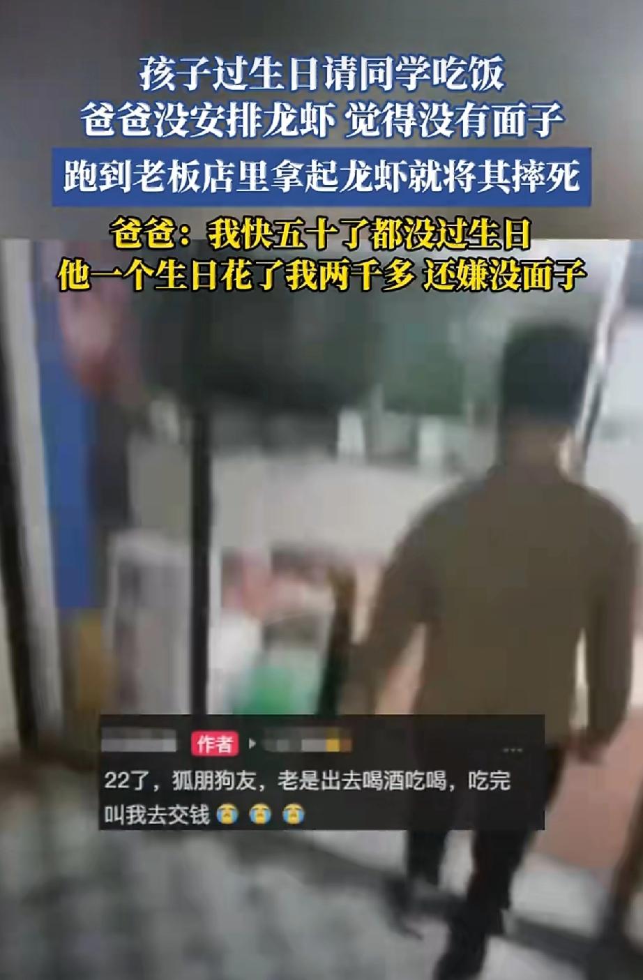 一男子22岁了 过生日那天请自己的朋友们吃饭 吃饭花了两千多还是自己爸爸付的钱 就因为父亲没有安排龙虾这道菜 让自己觉得在朋友面前很没面子 一怒之下把饭店老板店里的龙虾摔死 看到这就感到很悲哀 22岁了一点也不体谅父母挣钱的不易 是不是在溺爱中长大的 脾气还这么暴躁 唉![叹气]