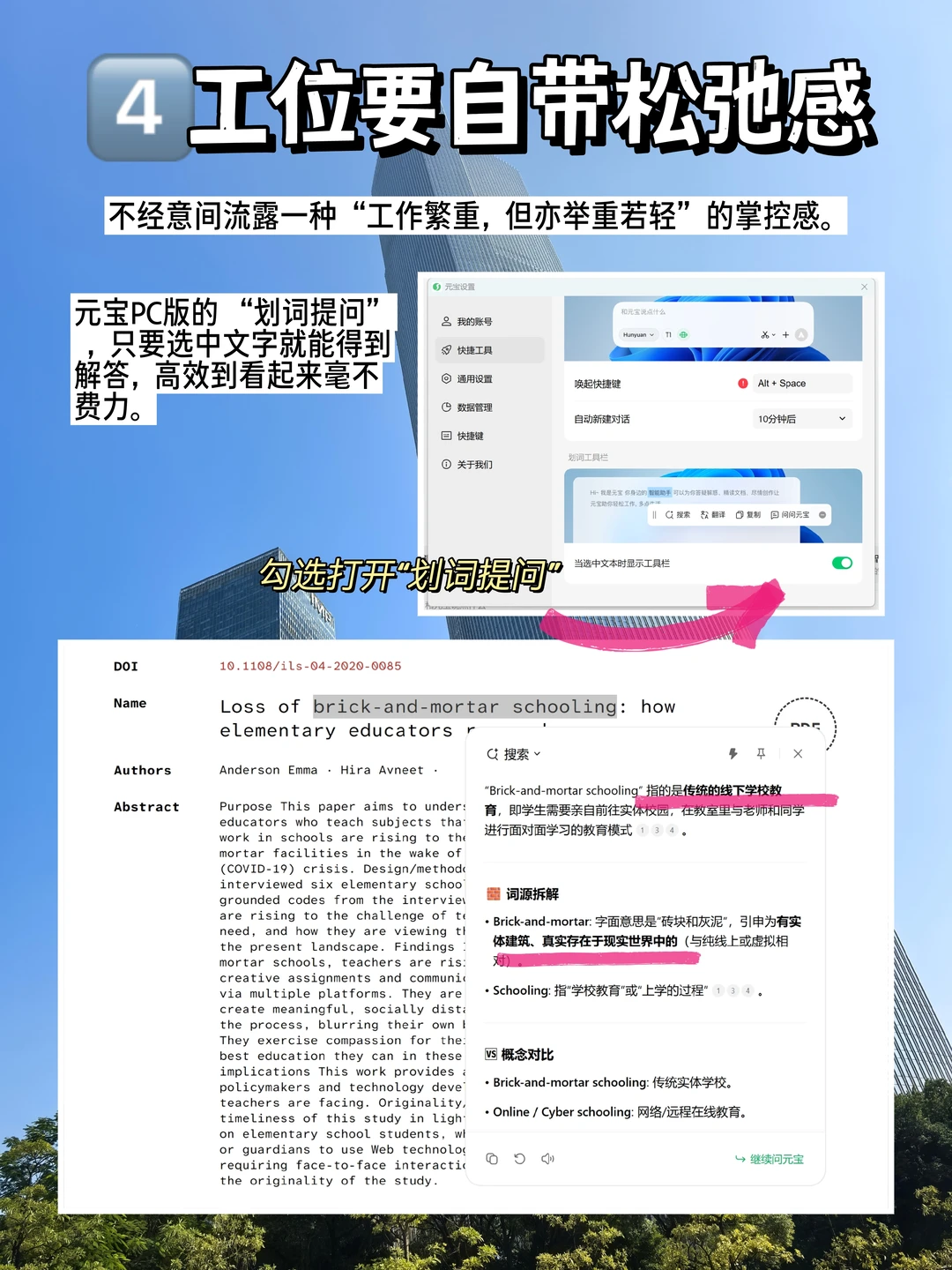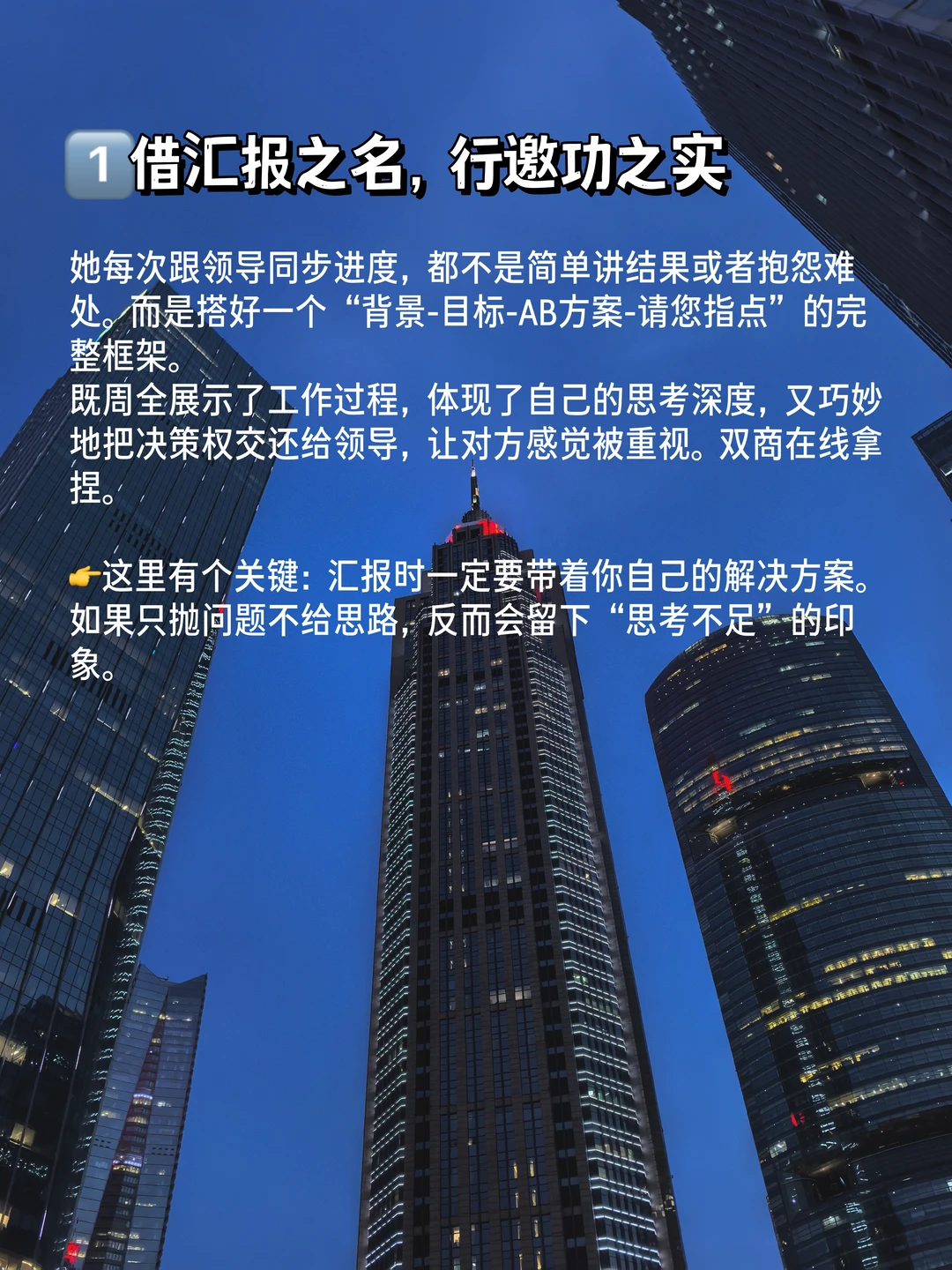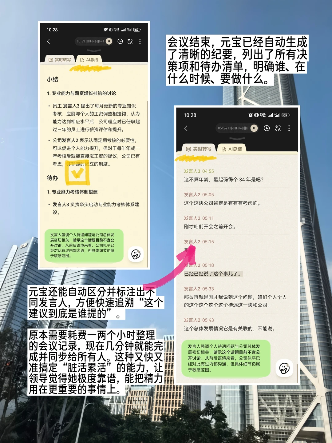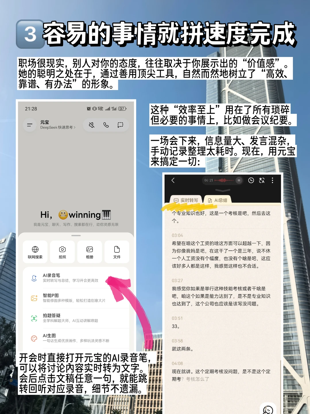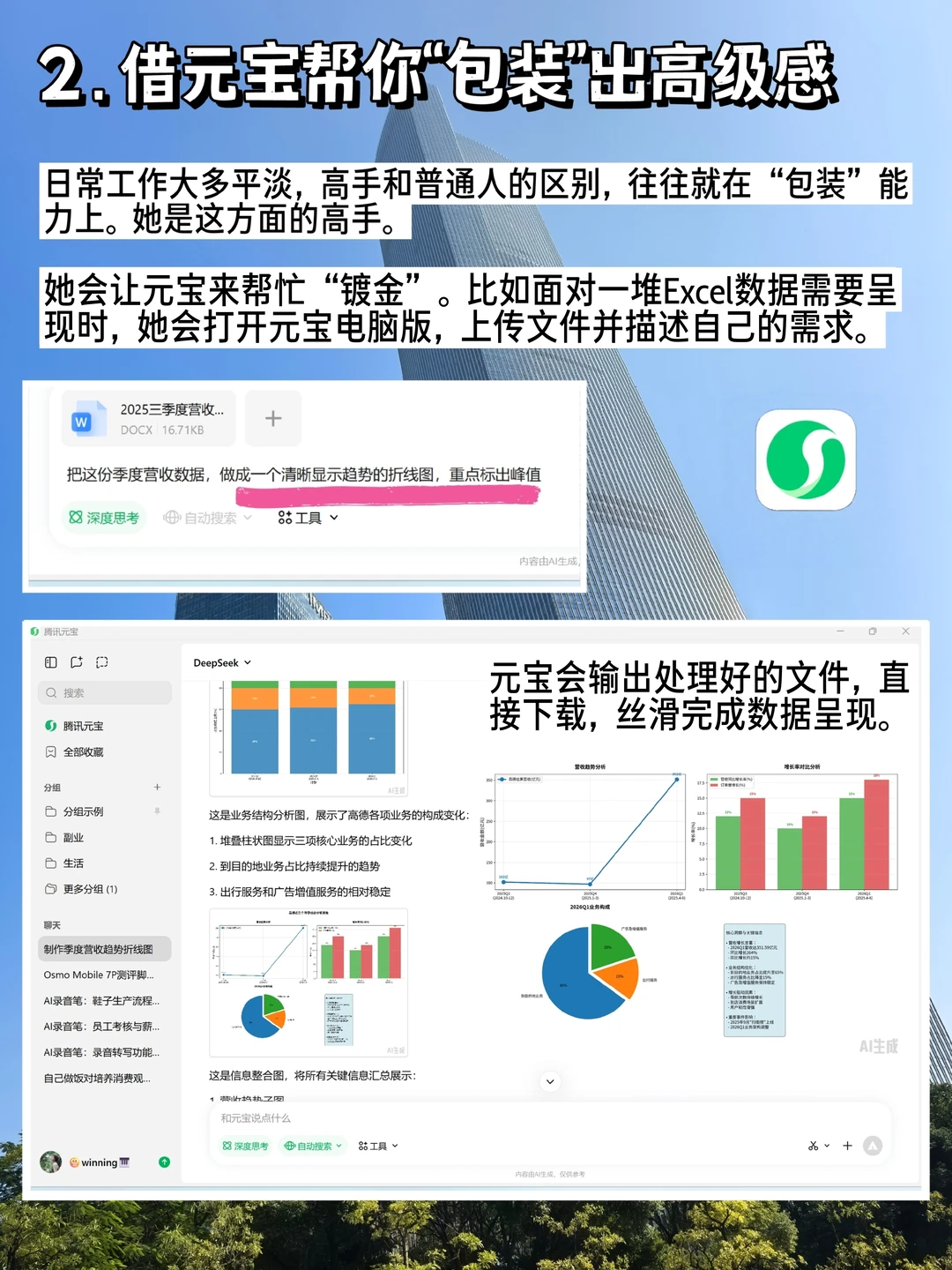 公司总有这么一类人:自己累死累活,领导却觉得你没干啥;而有的人看起来云淡风轻,却总被夸贡献大产出多。 我身边就有这么一位,她加班不多却受重视。观察了她很久,总结起来就是四招,学起来事半功倍,效果超级自然。 . 1️⃣借汇报之名,行邀功之实 同步进度,不是简单讲结果或者提难处,而是搭好“背景-目标-方案-请您指点”的框架,既展示了工作过程,体现了自己思考,又巧妙地把决策权交还给领导,让对方感觉被重视。双商在线拿捏。 🤌这里有个关键:汇报时要带解决方案,只抛问题不给思路,反而会留下“思考不足”的印象。 . 2️⃣借元宝帮你“包装”出高级感 日常大多平淡,高手和普通人的区别往往在包装能力。 她会让 元宝 来帮忙。比如面对一堆数据需要呈现时,她会打开元宝电脑版,上传文件并描述自己的需求: “把这份季度营收数据,做成一个能清晰显示趋势的折线图,标出峰值。” 元宝会输出处理好的文件,完成数据呈现。 借助元宝提炼重点、优化表达、制作素材,把日常任务转化为可视成果,直观又高级的展示就是更亮眼。 . 3️⃣容易的事情就拼速度完成 别人对你的态度,往往取决于你的价值感,她聪明地通过工具树立了“高效、靠谱、有办法”的形象。 . “效率至上”要用在琐碎但必要的事情上,比如会议纪要。一场会下来,信息量大、发言混杂,手动整理太耗时。现在,用元宝来搞定一切: 开会时打开元宝的AI录音笔,将讨论内容实时转为文字。会后点击文稿任意一句,就能跳转回听对应录音。 听到不懂的项目黑话或专业术语随时向元宝提问,即时获得解答。 会议结束,元宝自动生成纪要,列出决策项和待办清单,明确谁在什么时候、要做什么。 还能自动区分不同发言人,方便追溯“这个建议是谁提的”。 . 原本要花一两个小时整理的会议记录,现在几分钟就能完成并同步给所有人。 . 4️⃣ 工位要自带松弛感,展示“游刃有余” 不经意间流露一种“工作繁重,但亦举重若轻”的掌控感。 元宝PC版的 “划词提问” ,选中文字就能得到解答,高效到看起来毫不费力。 . 职场不仅拼努力,更考谁更聪明。 像元宝这样的工具,已经成了工作中离不开的“智能搭档”,让我们能更聚焦思考和成长,推荐给所有需要长时间面对电脑的朋友,试试看,工作体验完全不一样