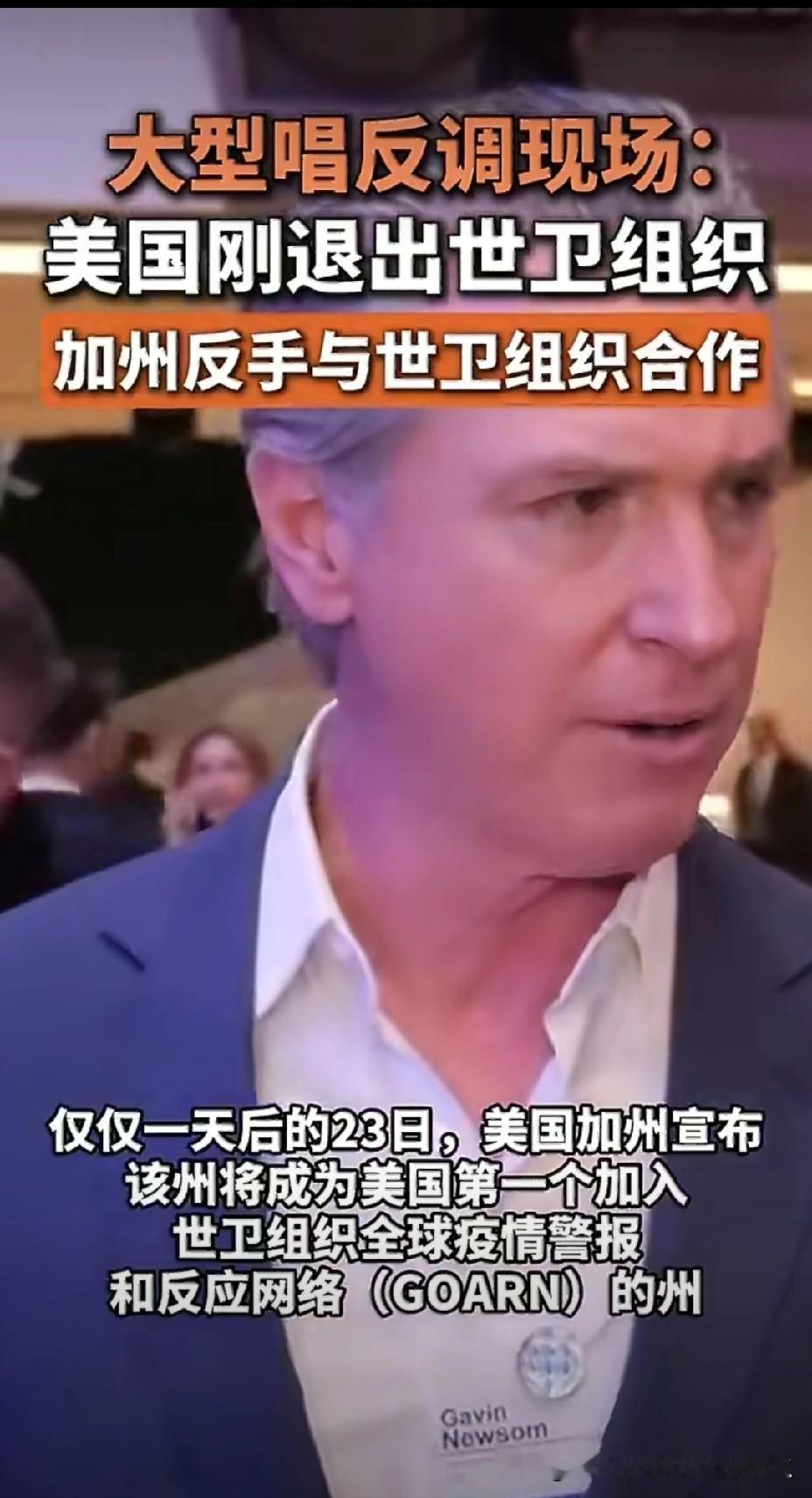 美国加州州长绝对是个犟脾气, 特朗普前脚刚宣布退出世界卫生组织, 加州州长纽森就宣布加州与世界卫生组织合作, 这摆明了就是不给特朗普面子啊。 看来美国内部共和党与民主党的割裂还在继续, 而且纽森这边开了个头, 估计后面还会有越来越多的州开始唱反调, 就看接下来这状况特朗普拿出什么办法来搞定了, 不然就只能又是拿国外哪个国家转移视线。 加州反特朗普