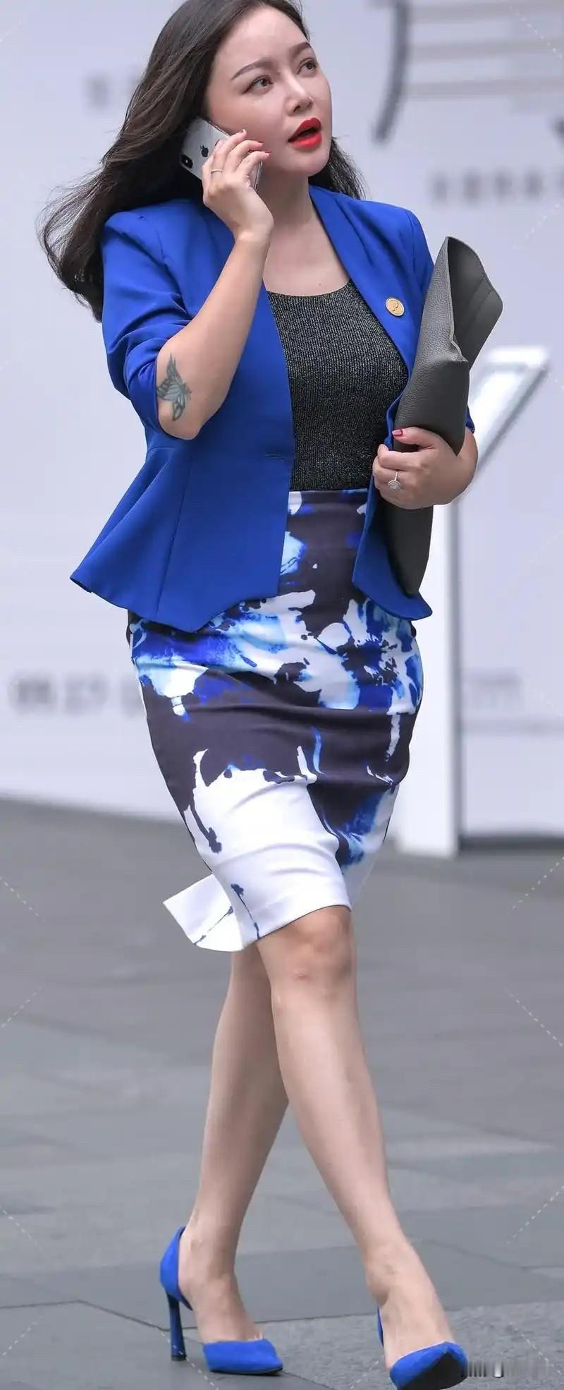 都市时尚穿搭指南:蓝色西装外套+印花裙,优雅又自信!