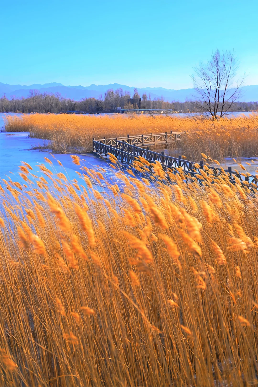 👉 金黄芦苇荡随风摇曳🌾,木栈道延伸至湖心💦,远处雪山倒映在结冰的湖面上🏔️,随手一拍都是电影感大片!