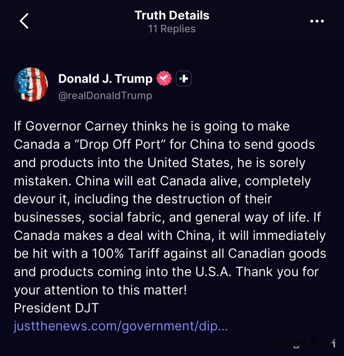 特朗普放话威胁:若加拿大胆敢与中国达成协议,美国将对其商品征100%关税。 华盛顿时间2026年1月24日,美国总统唐纳德·特朗普于社交媒体平台“真相社交”发文称: 倘若加拿大胆敢与中国达成协议,所有输美加拿大商品和产品将即刻被加征100%的关税。 特朗普翻来覆去就会一招:关税! 特朗普发帖翻译: 如果卡尼州长以为他能把加拿大变成中国向美国输送商品的“转运港”,那就大错特错了。中国会把加拿大"彻底吞噬",包括摧毁加拿大的企业、社会结构和生活方式。如果加拿大与中国达成协议,所有进入美国的加拿大商品都将立即面临100%的关税。
