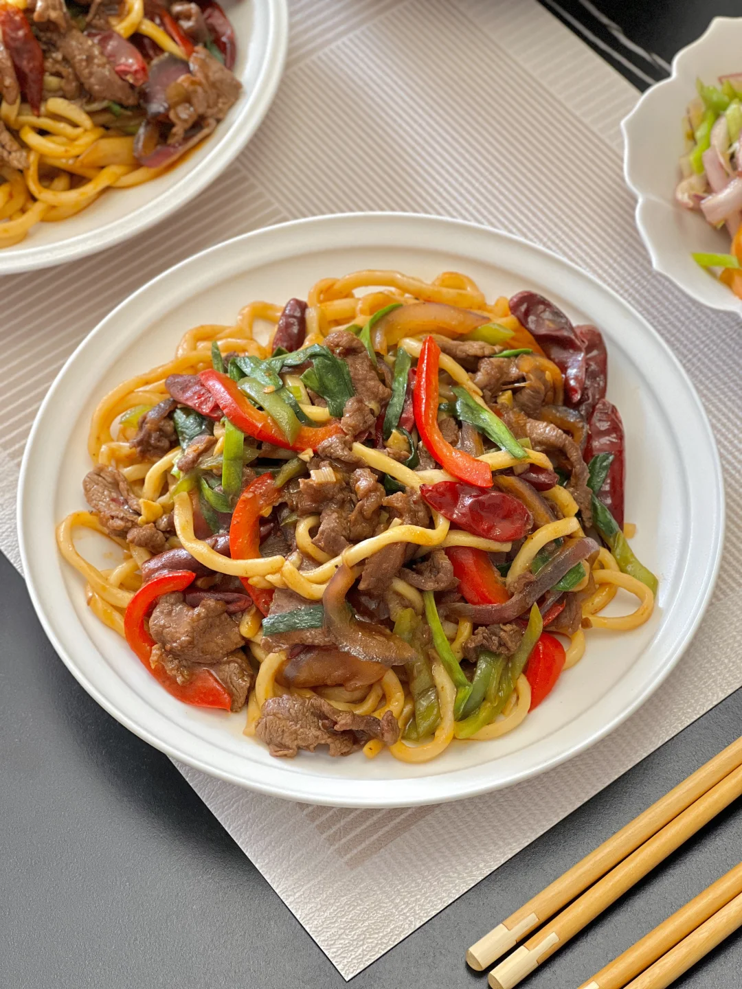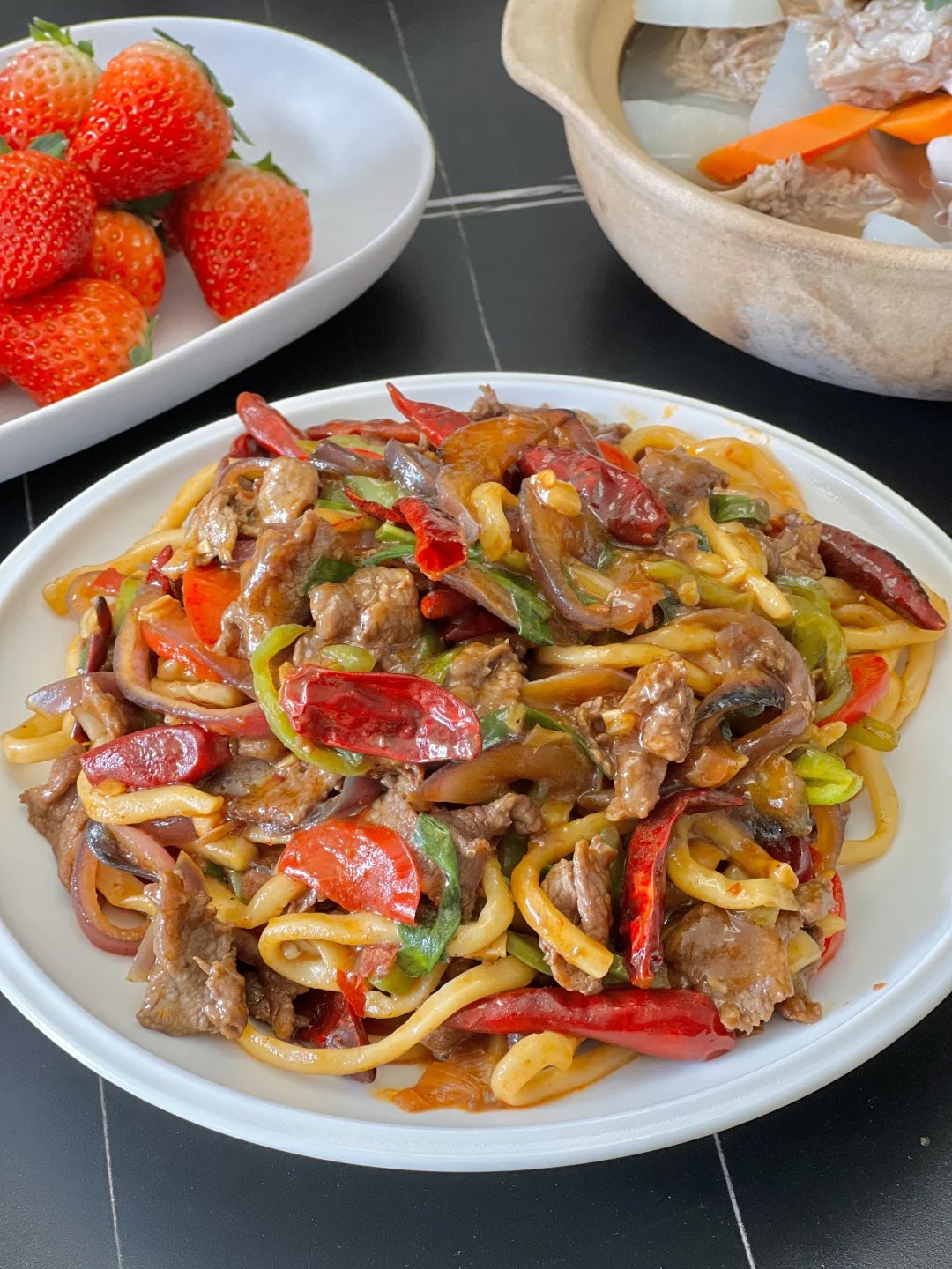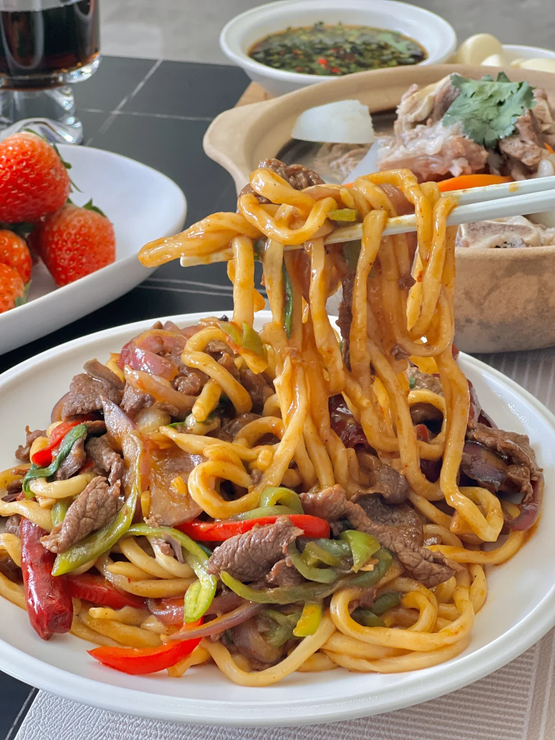 好久没吃面条了,家属点名要吃新疆干煸炒面,今天自己研究研究做了一次,每人干掉一大盘[大笑R]每根面条上都裹着酱汁,一口下去满满的肉和菜,可太香啦,美中不足家里的干辣椒太一般,下次我还是得买点新疆的辣皮子,肯定更好吃[暗中观察R] 【干煸牛肉炒面】 【皮辣红】 【萝卜羊肉汤】