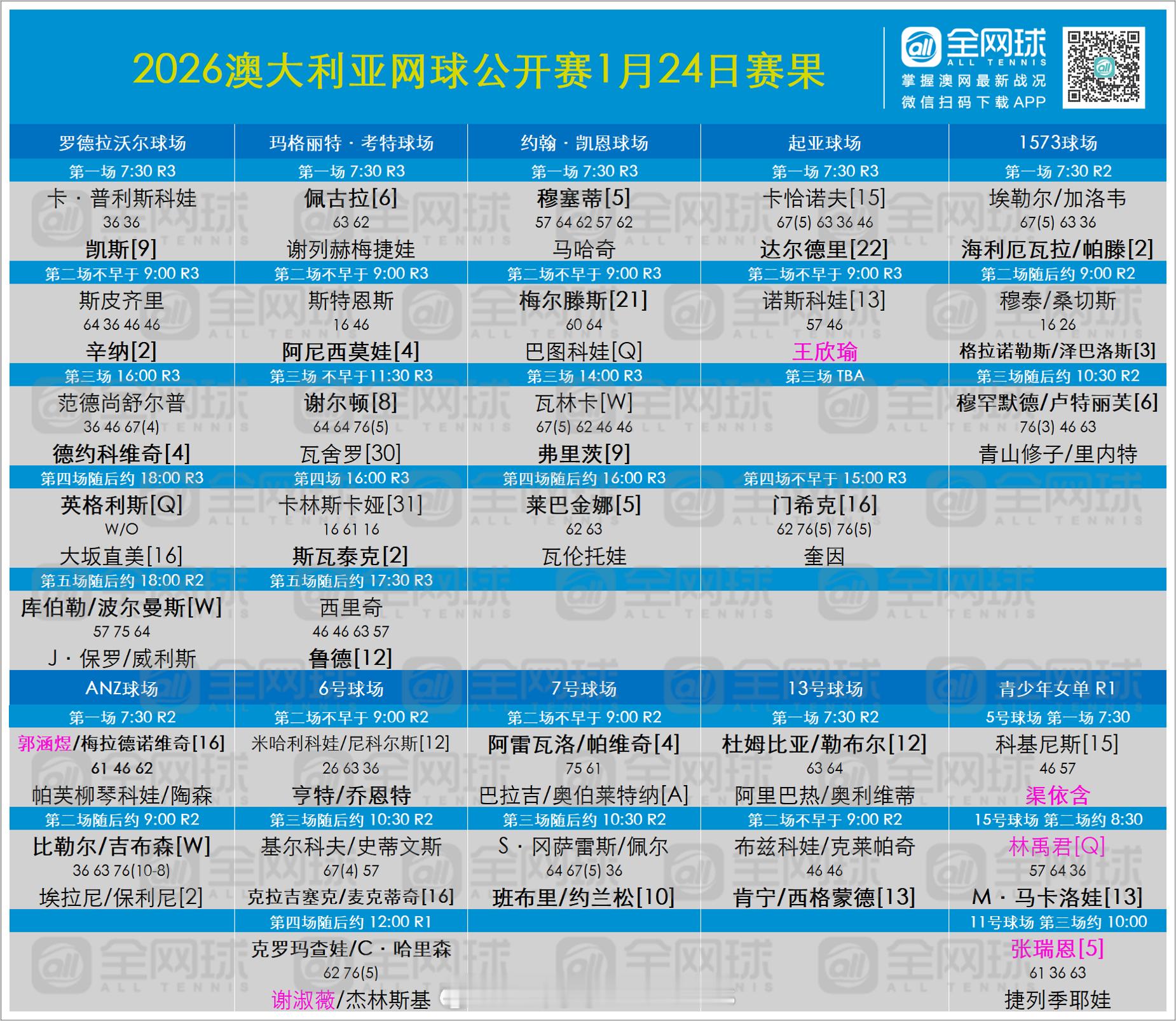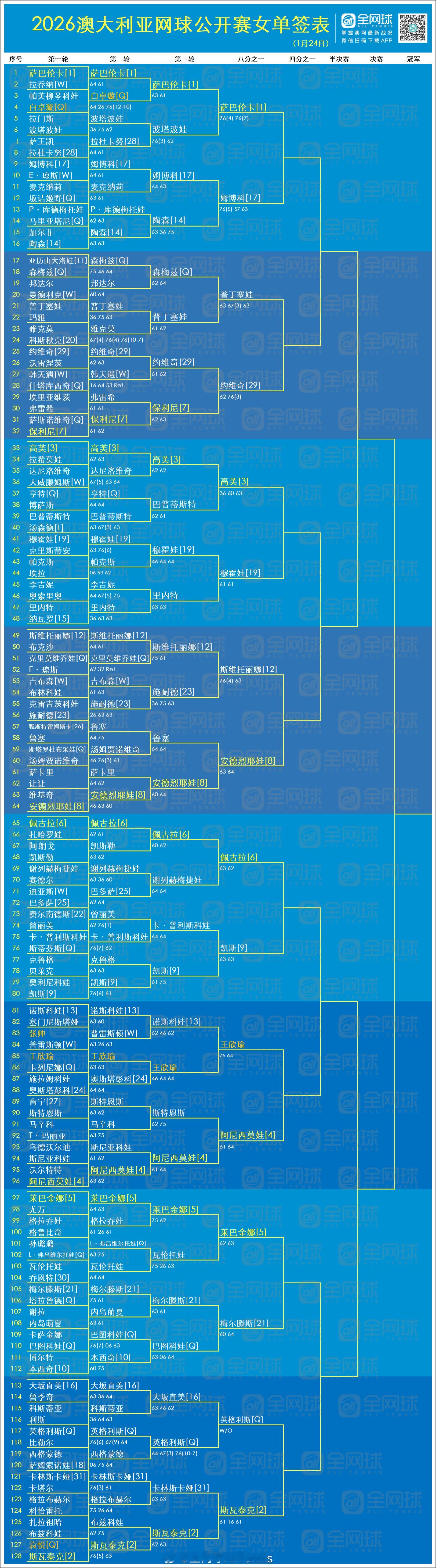 澳网2026 第七日赛果与签表更新🎙️男女单16强新鲜出炉🔥男单:【1】阿尔卡拉斯 vs 【19】保罗 【10】布勃利克 vs 【6】德米纳尔【3】兹维列夫 vs 【18】弗-塞伦多洛 【11】梅德维德夫 vs【25】勒纳-钱 【5】穆塞蒂 vs【9】弗里茨【16】门希克 vs 【4】德约科维奇【8】谢尔顿 vs 【12】鲁德【22】达尔德里 vs 【2】辛纳女单:【1】萨巴伦卡 vs 【17】姆博科 普汀塞娃 vs【29】约维奇 【3】高芙 vs 【19】穆霍娃 【12】斯维托丽娜 vs【8】米拉·安德烈娃【6】佩古拉 vs 【9】凯斯王欣瑜 vs 【4】阿尼西莫娃【5】莱巴金娜 vs 【21】梅尔滕斯 【Q】英格利斯 vs 【2】斯瓦泰克All Tennis All Life