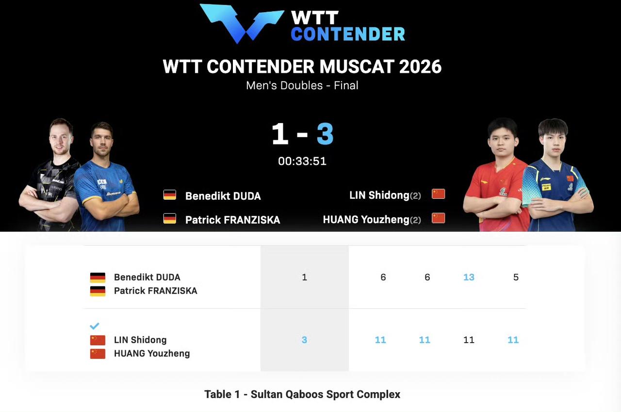 WTT常规挑战赛马斯喀特站冠军榜! 混双冠军🏆:玛纳什·沙/奇塔莱(印度) 男双冠军🏆:林诗栋/黄友政 女双冠军🏆:覃予萱/纵歌曼 女单冠军🏆:石洵瑶 ♂单冠军🏆:温瑞博or弗朗西斯卡 决赛成绩: 黄友政/石洵瑶2-3玛纳什·沙/奇塔莱 林诗栋/黄友政3-1弗朗西斯卡/杜达 覃予萱/纵歌曼3-0杜凯琹/吴咏琳 石洵瑶4-0何卓佳 温瑞博0-0弗朗西斯卡