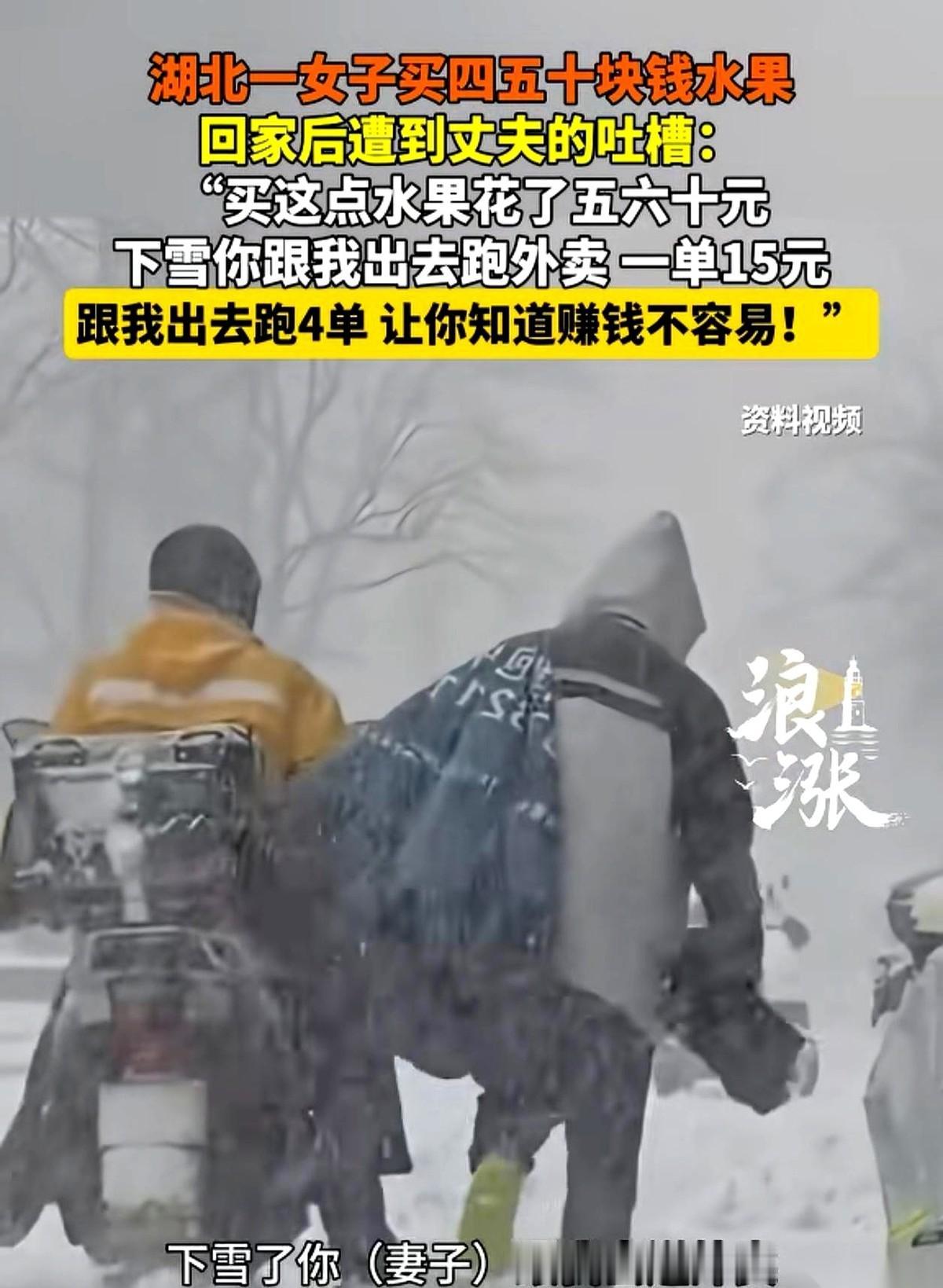 湖北一个跑外卖的男人,下班推开家门,指着桌上刚买的水果,冲着带孩子的媳妇就吼:“你现在就跟我出去跑4单!一单15,必须把这60块钱给我挣回来!” 桌上,一盒草莓红得刺眼,旁边是切开的菠萝蜜。 男人身上还带着外头的寒气,送餐箱的拉链都没拉利索,他盯着那点水果,眼睛先红了。开口第一句不是问孩子,而是问价钱。 “多少?” “五、六十……” 他一天顶着风跑下来,手机里显示的收入刚过200块。这一下,就去了四分之一。 他没摔东西,也没动手,就是那种压抑到极点的声音,一个字一个字往外蹦:“家里什么条件你不知道?让你花钱!你就知道花钱!” 那句“跟我出去跑4单”,不像气话,更像一道命令。 他媳妇没回头,也没吭声,就那么背对着他坐着,肩膀微微塌了下去。旁边玩着玩具的孩子,手里的动作也停了。整个屋子,安静得只剩下男人粗重的喘气声。 有人说,这就是穷。穷到一盒草莓,就能成为压垮一个成年人的最后一根稻草。 但也有人说,这不是穷,是心凉。日子都这么苦了,想给家里添一口甜,都有错了?