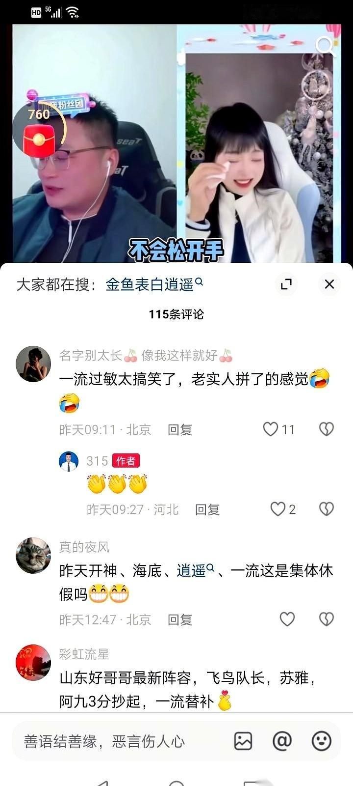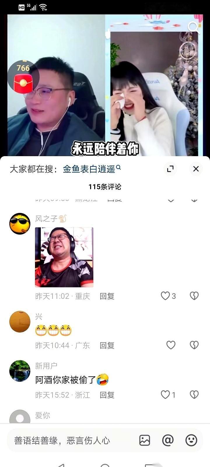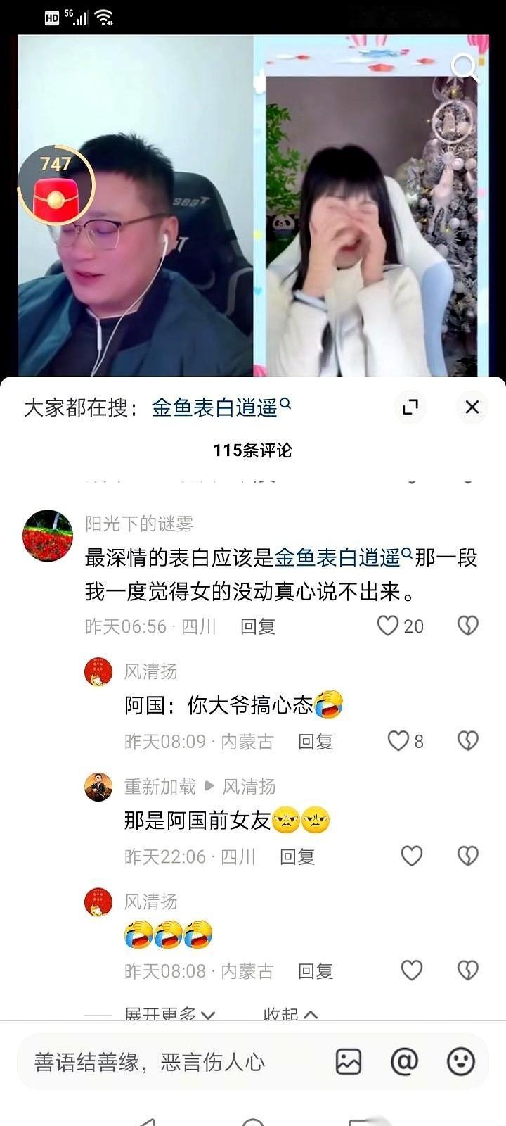 真没想到,一流和钙宝这对,竟然能以这种方式炸开。 一条评论,直接把金鱼和逍遥的表白给端上了台面。底下更绝,有人顺手就圈了阿国,整个评论区瞬间乱成了一锅粥。 屏幕往下滑,新回复跟子弹一样往外冒。 有人说看到阿酒直播的时候,脸当场就拉下来了,捏着手机的手指关节都微微发白,嘴上还硬撑着说都是节目效果,他有家庭。 可这叫什么节目效果?去年还你侬我侬地一起直播,今年转头就物是人非。一个人的瓜,炸出了一串人,一环扣一环,谁都跑不了。 说白了,这圈子哪有什么真情实感,屏幕前是搭档,屏幕后全是人情世故。 就是不知道,这锅大乱炖,最后到底是谁把谁给炖了?