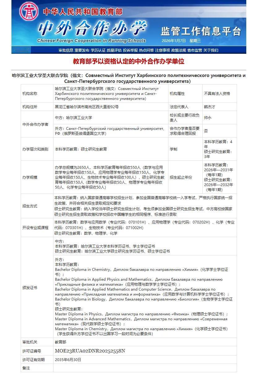 哈工大中外合作办学要升级了,与俄罗斯顶级名校圣彼得堡大学的中外合作办学项目2026年已升级为联合学院了。 该哈工大圣大联合学院办学层次为本硕,本科学历教育(4年)、硕士研究生教育(3年)。办学规模也不小,总规模2650人,本科每年招收550人,硕士每年招收150人。招生起止年份暂时为本科为2026—2031年(每年1期),硕士为2026—2032年(每年1期)。后期,如果合作愉快,还可以续签。 本科有4个招生专业,毕业双证不以出国为前提。数学与应用数学每年150人,应用物理学每年150人,化学每年150人,生物技术每年100人,合计每年550人。 硕士研究生教育(学制3年),一共150人。数学专业每年50人,物理学专业每年50人,化学专业每年50人。 这些本科专业吧,算不上热门,也算可以。都是基础学科,也就是数理化生这四科,生物稍微坑一点。 哈工大这几年高考招生时的超短裙操作被人诟病,尤其是北京家长,为什么呢?它把招生人数都放到高收费的中外合作办学了,学费几千块的统招专业没几个人数,也就个位数不到十人。哈工大这么做,是觉得北京家长人傻钱多么?虽然大部分家长付得起中外合作办学的学费,但也不能吃相这么难看吧,就7个普通指标,其他全中外合作。你倒是深圳校区也给几个指标,估计就没多人说了。 你们说是不是?