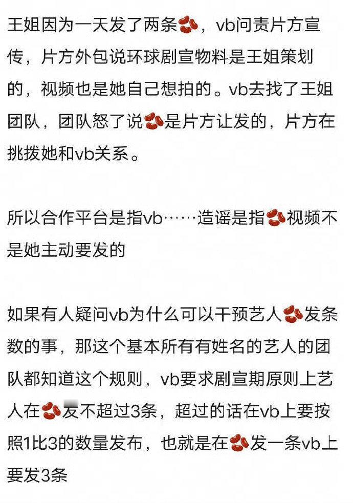 王姐一天发了两条🫘,微博问责了剧方,剧方说是王姐策划的……这事已经严重的又发pyq又发声明的程度... 那剧宣安排发2条的时候团队不知道平台会有限制吗?为何当时不拒绝? (平台确实霸王条款,但既然接受这个条款就履行呗)