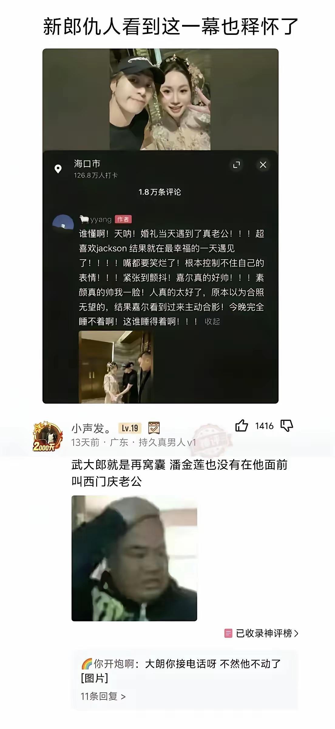 网友说:武大郎再窝囊,潘金莲也没在他面前叫西门庆老公。 心疼新郎一秒钟。 不知道新郎见到新娘发的图文时作何感想? 此时此刻是天崩地裂,还是众生和谐? 新娘 新郎 追星 追星女孩