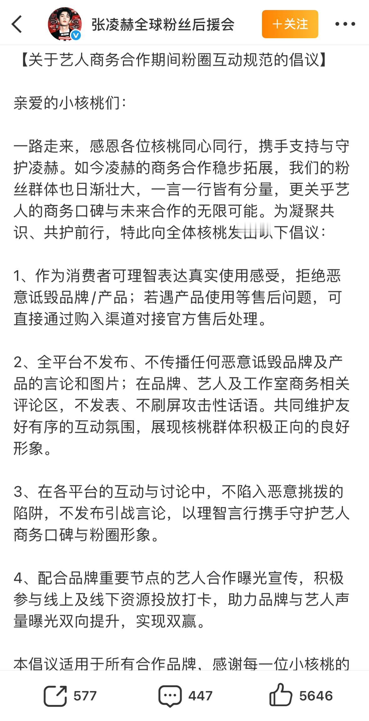 张凌赫后援会发了提倡让粉丝不要冲品牌.但我觉得张凌赫的咖位,待遇确实应该要更好一