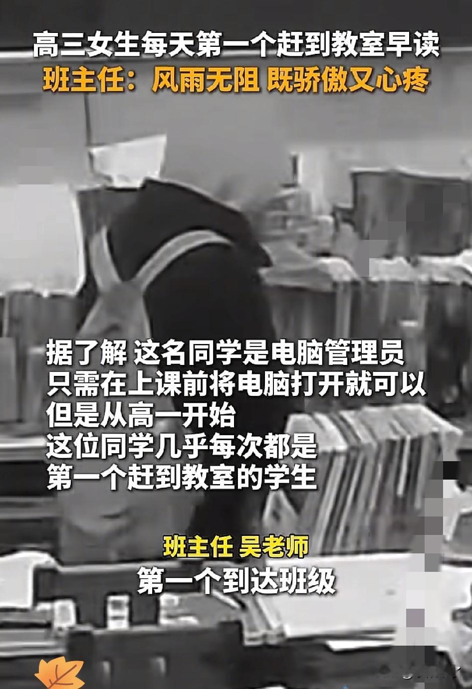 近日,山东临沂,一高三班主任老师打开监控想看看,学生到校早读的情况,谁知,他意外发现,每天早晨都是同一个学生头一个到教室里,想想这几天天气寒冷,他满是心疼。 班主任查早读监控发现,班里的电教管理员女生,从高一到高三日日第一个到教室,极寒天也风雨无阻。到教室先麻利开电脑,再静静落座早读,空荡教室里那个单薄的背影,又暖又戳心。 这哪里是简单的尽责,更是刻进骨子里的自律与坚守!比起一时的冲劲,这份日复一日扛住严寒、耐住孤独的坚持,才是成长最珍贵的底气。 高考从不是人生的唯一答案,但这份拼尽全力的模样,早已为她的未来攒足了光。 那些默默努力的时光从不会被辜负,努力或许未必能达成所有目标,但这份不放弃的韧劲,终将成为人生路上最硬的底牌! ​加油,少年!