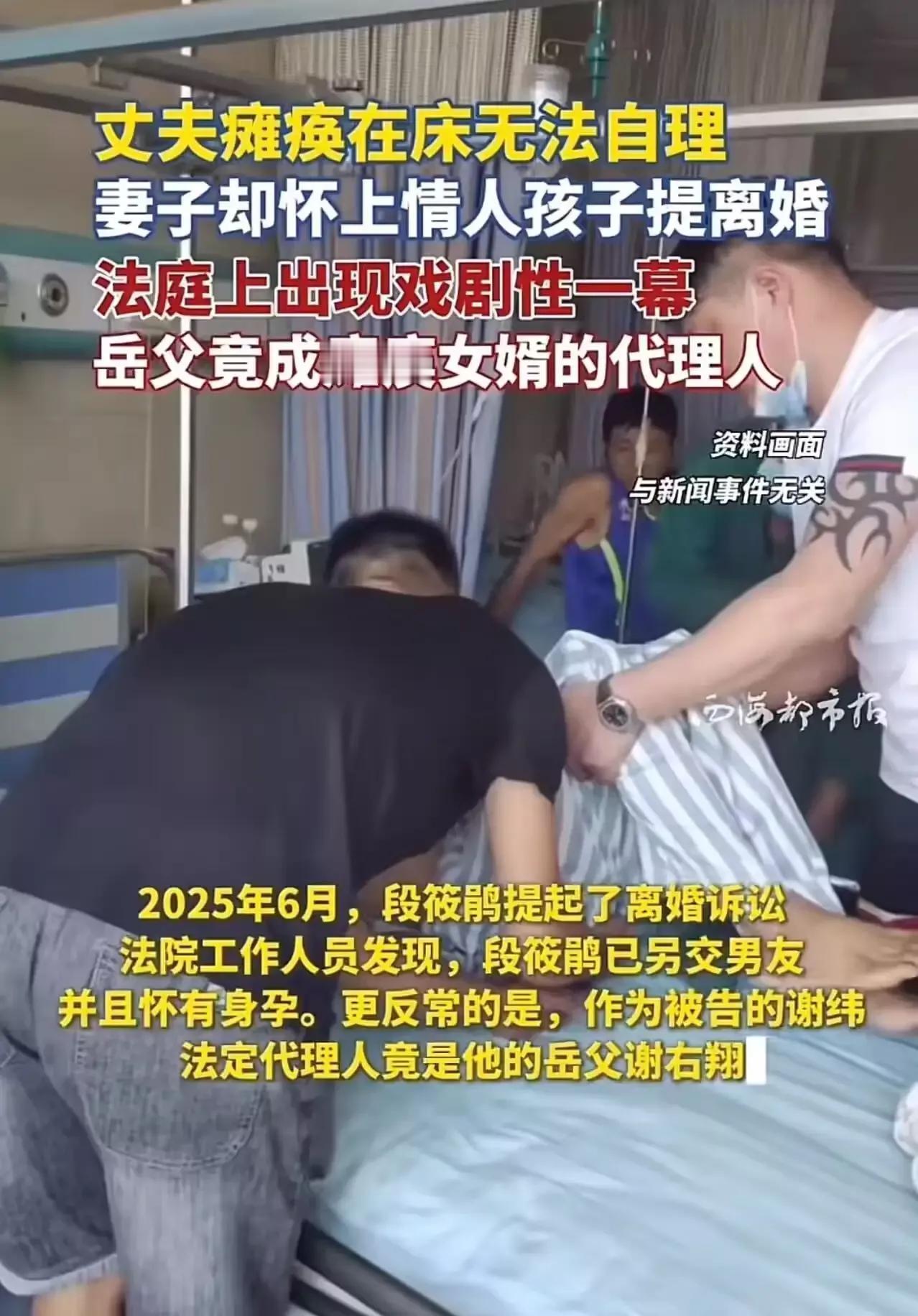 丈夫瘫痪在床无法自理,妻子却怀上情人孩子并提出离婚,法庭上出现戏剧性icon一幕:岳父竟成瘫痪女婿的代理人!网友怒斥:“丈夫瘫痪后,妻子有权提出离婚,但不能在离婚前出规怀孕,这样做违背民法icon良俗!” 在这个充满戏剧性的案件中,似乎每一幕都像是一场人性与道德的较量。丈夫瘫痪在床,曾经的伴侣却在他最无助的时候,选择了背叛与伤害。更令人震惊的是,妻子竟然怀上了情人的孩子,并在法庭上提出离婚,似乎一切都在她的预谋之中。而更为戏剧性的是,岳父竟然成了瘫痪女婿的代理人,这一幕仿佛从电影中走出来的荒诞剧情,却真实发生在我们身边。 这起案件引发了网友们的强烈愤怒和深刻反思。有人怒斥:“丈夫瘫痪后,妻子有权提出离婚,但不能在离婚前出规怀孕,这样做违背民法良俗!”这句话点出了公众心中的道德底线——无论情感如何变迁,基本的善良与道义都不应被践踏。有人质问:“难道在这个社会里,法律的底线已经被如此轻易地踩踏了吗?我们是否还相信婚姻的神圣与责任?” 然而,细细想来,这个故事背后隐藏的,是更深层次的人性探讨。我们不得不问:在极端的困境中,一个人的选择是否还能代表善良?当爱变成了利益的交换,责任变成了可抛弃的负担,家庭的意义又在哪里?这场荒诞的戏码,或许正映射出社会中一些隐藏的阴影——家庭关系的脆弱、道德底线的模糊,以及法律与人性的博弈。 这不仅仅是一个个体的悲剧,更是一个时代的缩影。我们看到的,是一个社会在快速变迁中,价值观的迷失与重塑。有人说,法律是底线,但在现实中,法律能否真正保护那些最需要帮助的人?面对家庭的背叛与伤害,我们是否还能坚守那份最初的善意与责任? 这个案件让人愤怒,也让人深思。它提醒我们:家庭不是用来背叛和伤害的战场,而是温暖与责任的港湾。我们每个人都应该从中汲取教训,守护那些最纯粹的情感,不让金钱与利益蒙蔽了人性的善良。毕竟,真正的幸福,不在于拥有多少,而在于我们是否用心去守护、去珍惜。 让我们期待,社会的正义与良知能像那一束微光,穿透黑暗,照亮每一个需要帮助的角落。因为,只有当我们都坚守底线,善良才能永远不灭。丈夫瘫痪在床上 瘫痪男人