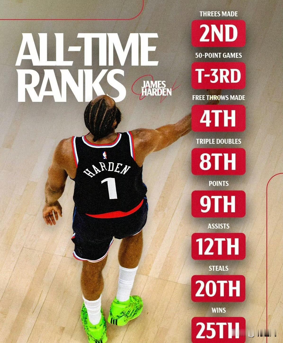 哈登的历史排名简直太疯狂了🤯而且他每天都还在攀登! • 三分命中数:历史第2位(超3200记),仅次于斯蒂芬·库里。 • 50+得分场次:并列历史第3位。 • 罚球命中数:历史第4位(超8300记)。 • 三双次数:历史第8位,作为双能卫,兼具顶级得分与组织能力。 • 总得分:历史第9位(超28400分),现役球员中仅落后于勒布朗·詹姆斯与凯文·杜兰特。 • 总助攻:历史第12位(超8500次),是现役除詹姆斯、威少,保罗以外助攻最多的后卫 • 总抢断:历史第20位(超1750次)。 • 胜场数:历史第25位。