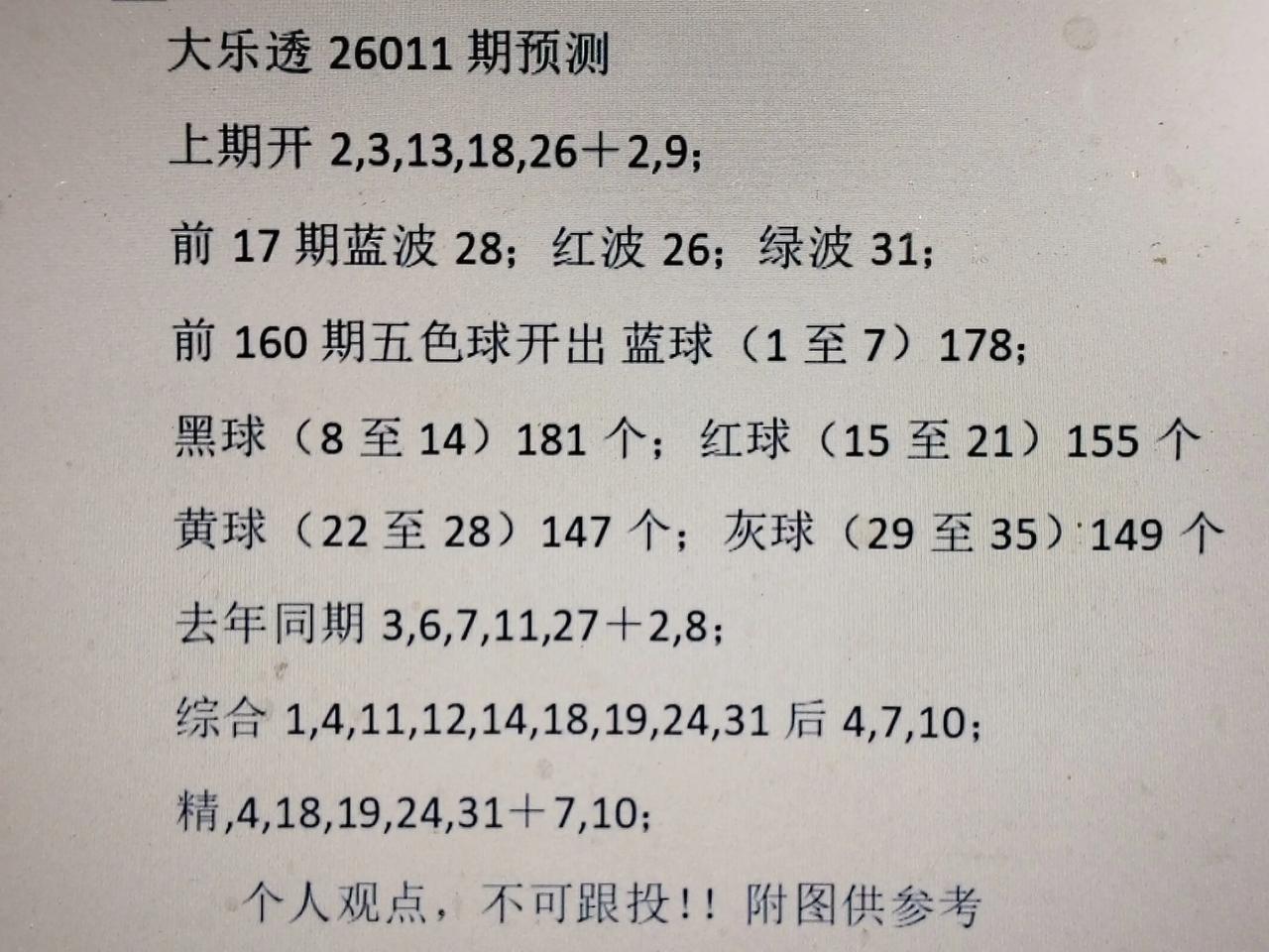 上期前区开出三红波两蓝波无绿波号。开二连号。3尾已开七期,本期估计仍然要防13,23。 本期估计应该红波号三个,蓝波1个或0,绿波1一2个。 上期后区开出2路号三期,加0路号9。已多期没开1路号,本期4,7,10应该有号开出!