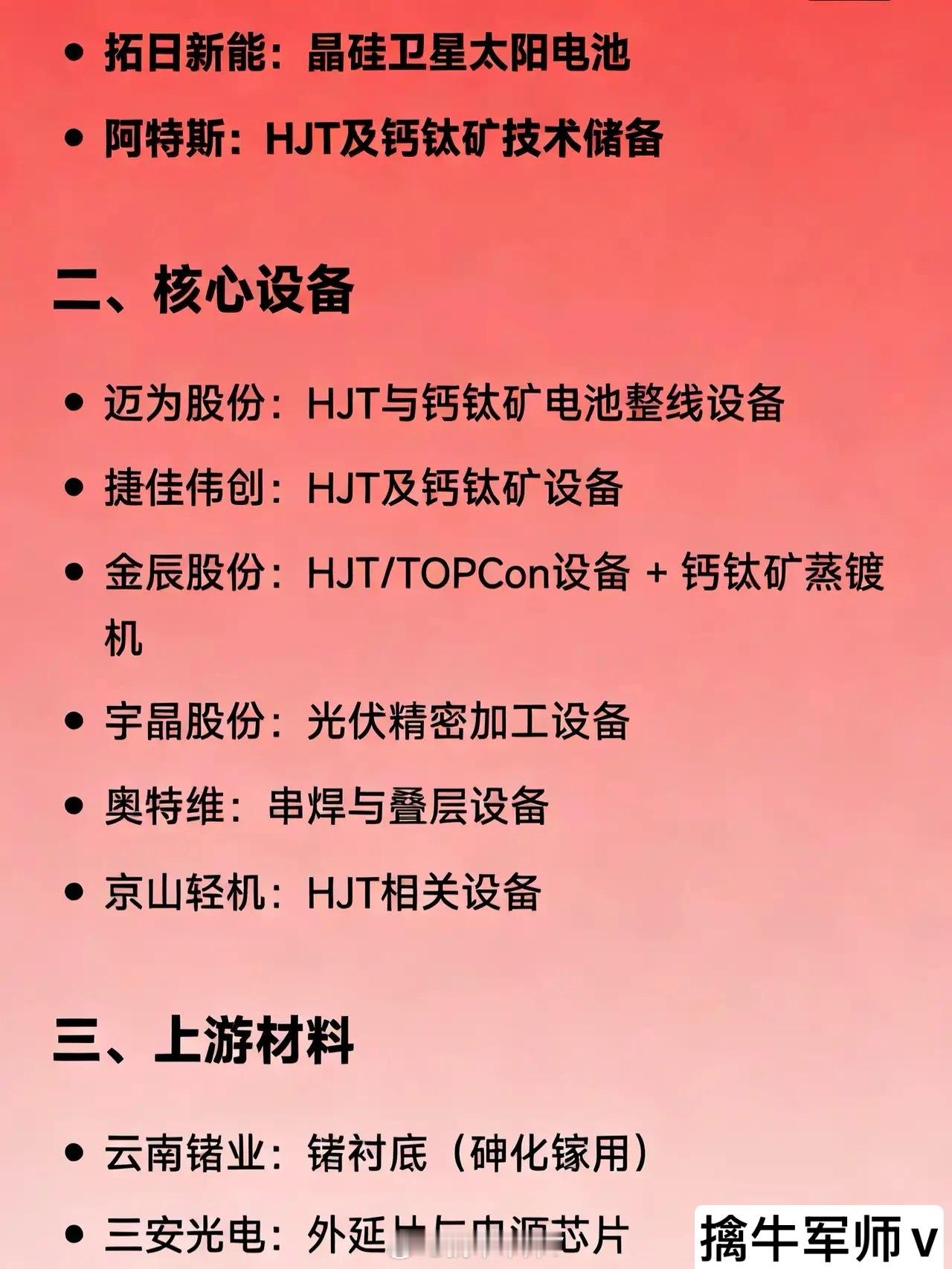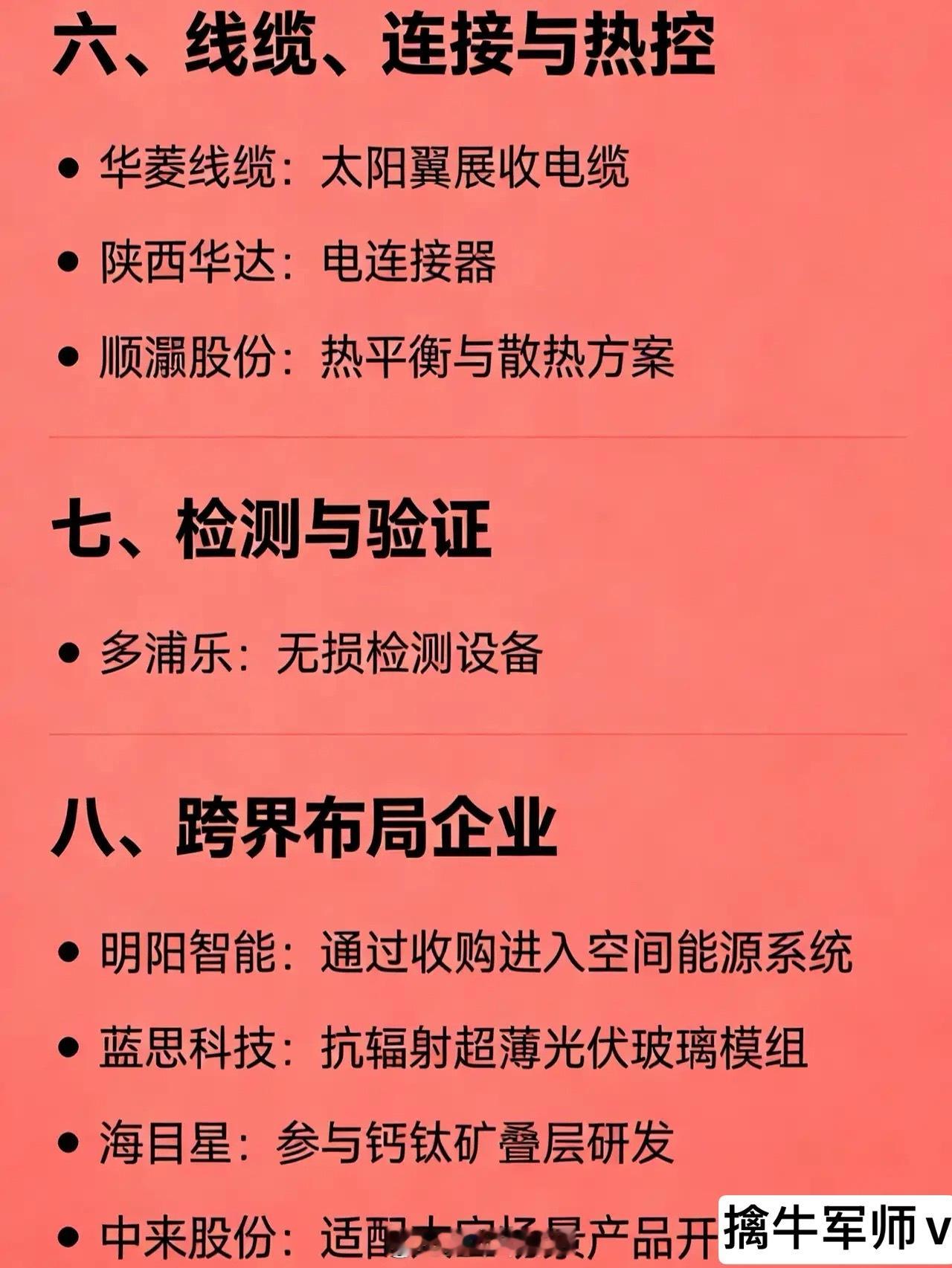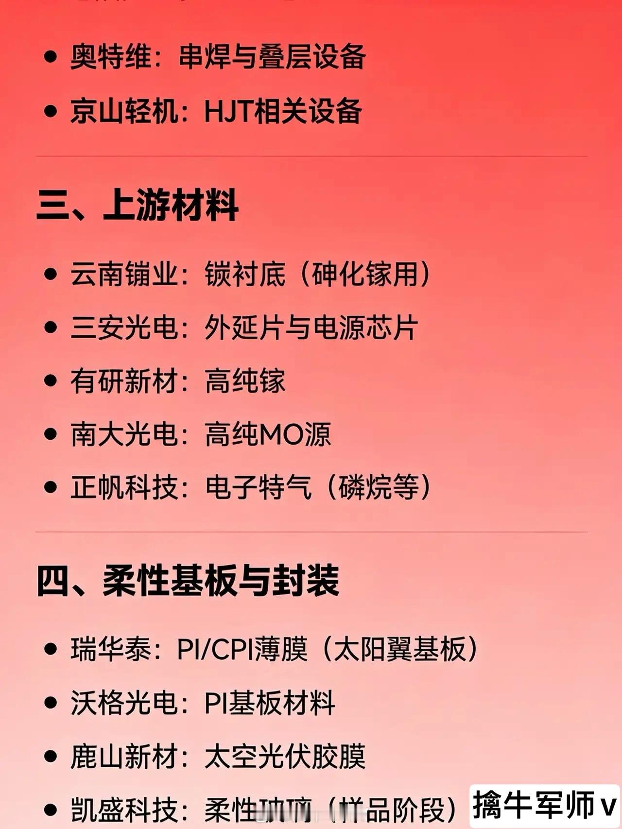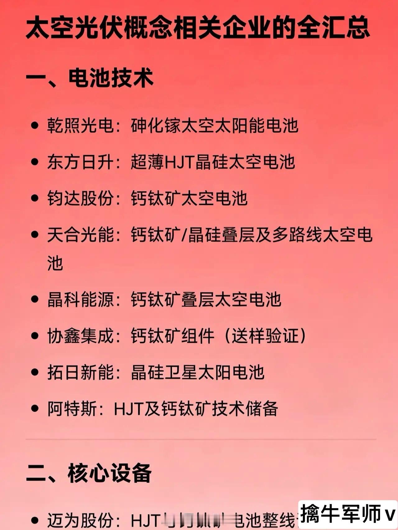 太空光伏概念相关企业的全汇总一、电池技术乾照光电:砷化镓太空太阳能电池东方日升:超薄HJT晶硅太空电池钧达股份:钙钛矿太空电池天合光能:钙钛矿/晶硅叠层及多路线太空电池晶科能源:钙钛矿叠层太空电池协鑫集成:钙钛矿组件(送样验证)拓日新能:晶硅卫星太阳电池阿特斯:HJT及钙钛矿技术储备 二、核心设备迈为股份:HJT与钙钛矿电池整线设备捷佳伟创:HJT及钙钛矿设备金辰股份:HJT/TOPCon设备 + 钙钛矿蒸镀机宇晶股份:光伏精密加工设备奥特维:串焊与叠层设备京山轻机:HJT相关设备 三、上游材料云南锗业:锗衬底(砷化镓用)三安光电:外延片与电源芯片有研新材:高纯镓南大光电:高纯MO源正帆科技:电子特气(磷烷等) 四、柔性基板与封装瑞华泰:PI/CPI薄膜(太阳翼基板)沃格光电:PI基板材料鹿山新材:太空光伏胶膜凯盛科技:柔性玻璃(样品阶段) 五、太阳翼系统与结构件中国卫星:卫星总体与太阳翼集成航天电子:电源控制单元(PCU)航天环宇:太阳翼展开机构隆盛科技:轻量化结构支撑光威复材:碳纤维支撑结构 六、线缆、连接与热控华菱线缆:太阳翼展收电缆陕西华达:电连接器顺灏股份:热平衡与散热方案 七、检测与验证多浦乐:无损检测设备 八、跨界布局企业明阳智能:通过收购进入空间能源系统蓝思科技:抗辐射超薄光伏玻璃模组海目星:参与钙钛矿叠层研发中来股份:适配太空场景产品开发
