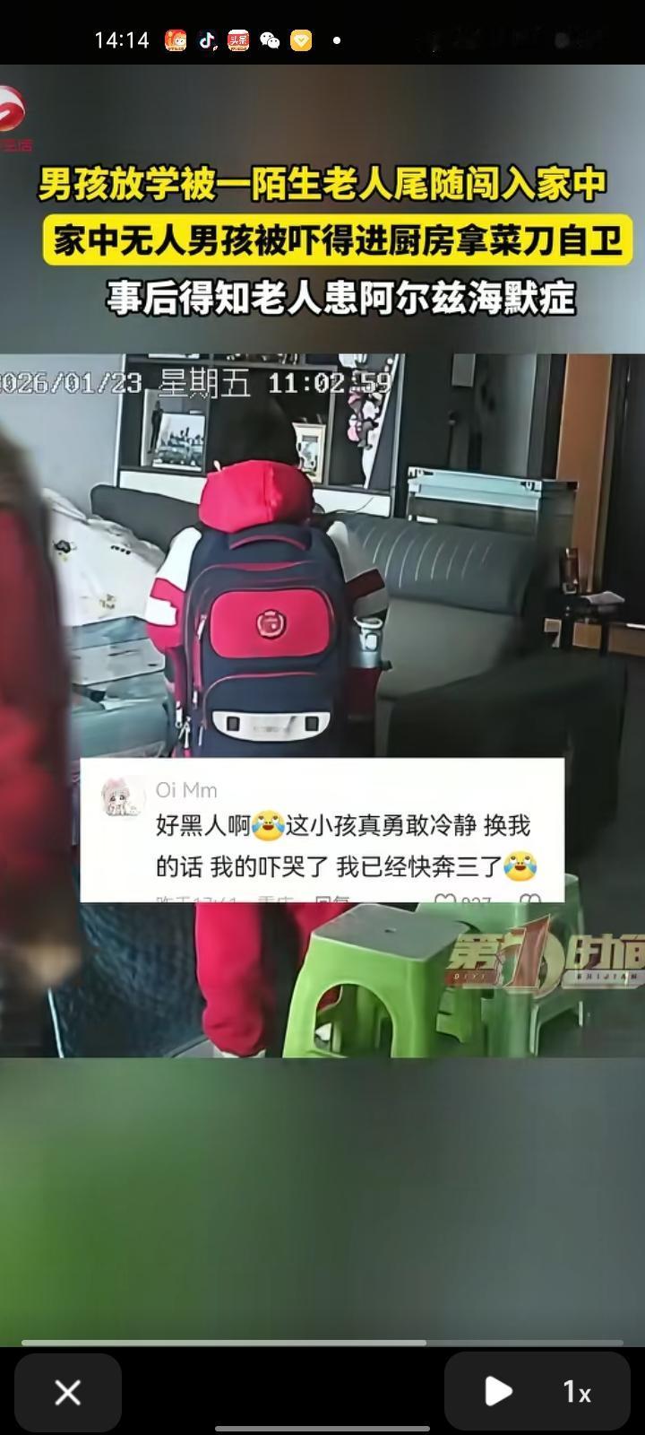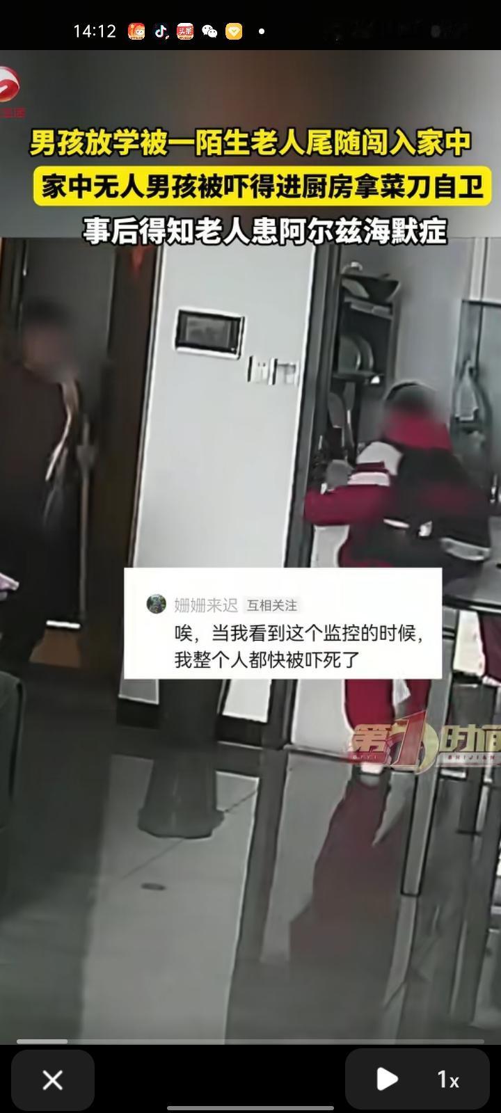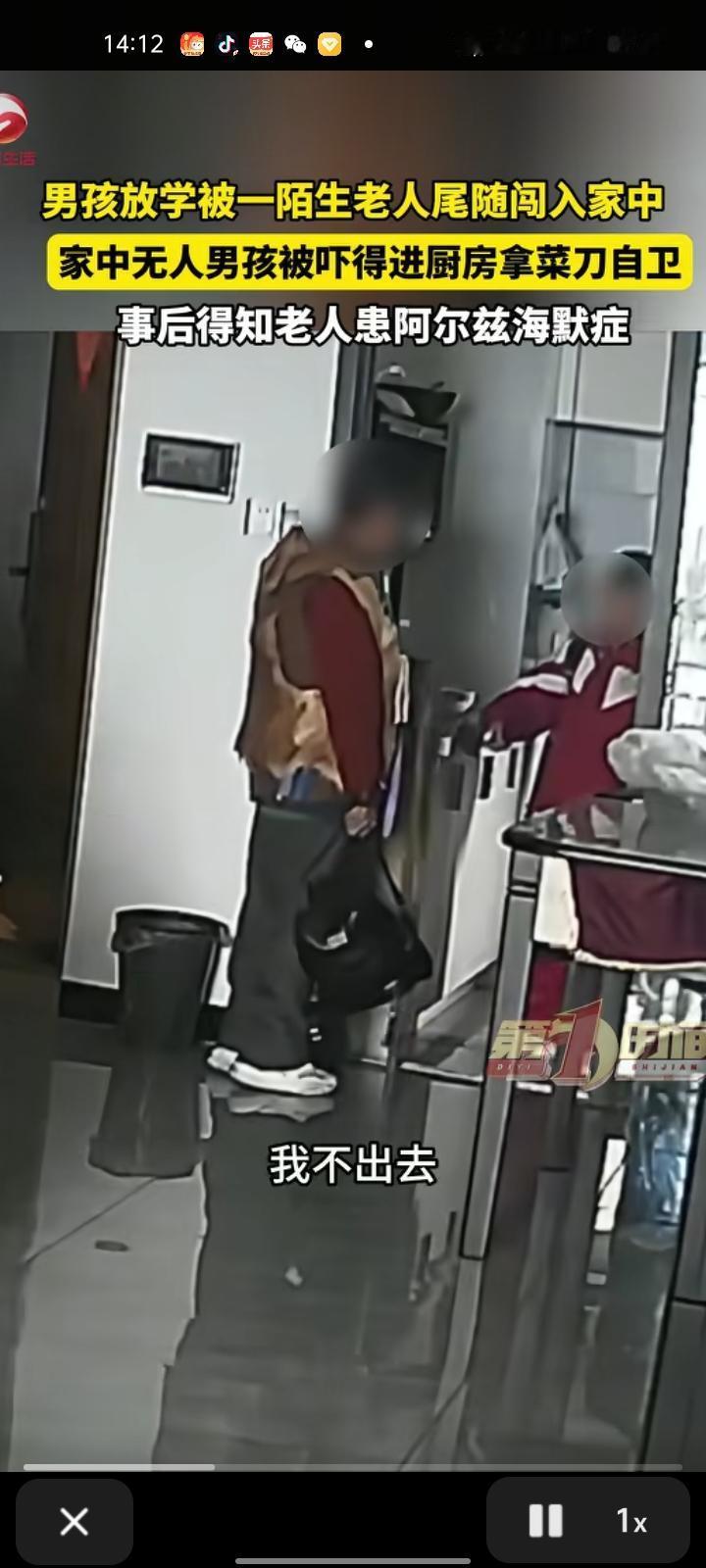 1月23日,贵州贵阳。孩子妈妈发布一段监控视频,儿子遭陌生老人尾随“强闯”入室,他还小根本拦不住,吓得进厨房拿菜刀自卫。随后,儿子拿起手机打电话,老人径直走了进来,看到老人要走,儿子把门关上阻止老人离开。 后来才得知,老人和孩子在同一小区,是不同楼栋。老人患有阿尔茨海默症,可能错认成自己家。孩子妈妈表示,假期即将到来,真给所有家长提个醒,安全无小事,不要把孩子一个人留在家。