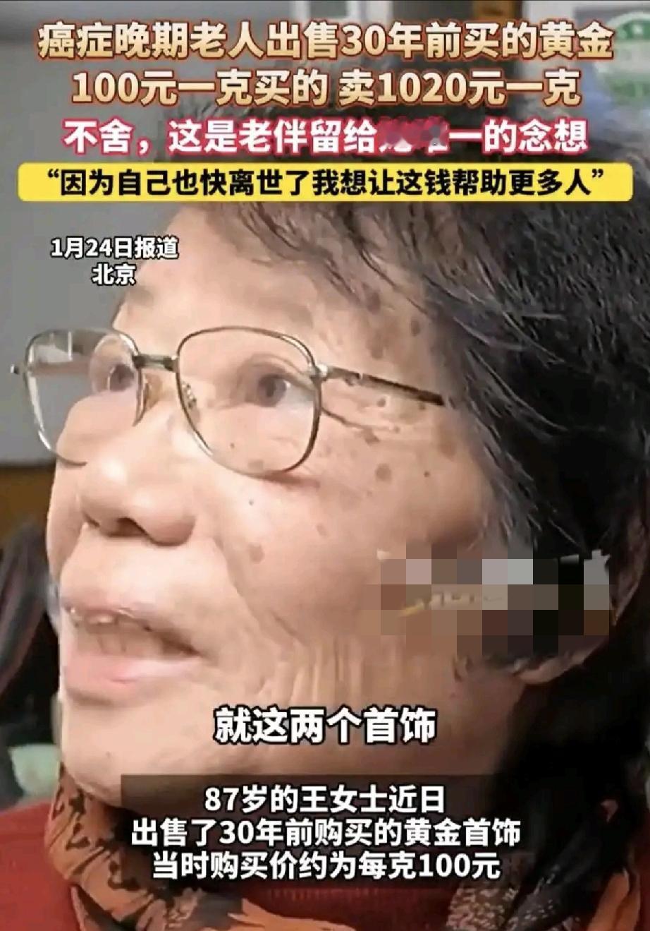 87岁癌症奶奶破防全网!卖掉30年金饰助人,价格翻十倍太暖心 87岁本该卧病静养,可这位癌症晚期的奶奶,却干了件让全网泪目的事——把珍藏30年的金饰全卖了,一分不留全用来帮别人!更让人感动的是,当年攒下的这些“宝贝”,如今价格翻了十倍,这大概就是善良自带的福报吧! 奶奶说,这些金饰是年轻时省吃俭用攒的,戴了半辈子舍不得离身,可看着别人有难处,比自己生病还难受。明明自己还在受癌症折磨,却满心想着帮衬他人,这份纯粹的善意,比金子还沉甸甸。咱中国人的情怀从来都这样,不管自己多难,总愿意伸手拉别人一把,老人的举动,正是刻在骨子里的善良,撑起了咱们社会最暖的底色。 你身边有这样善良的老人吗?如果是你,会舍得卖掉珍藏半生的宝贝助人吗?