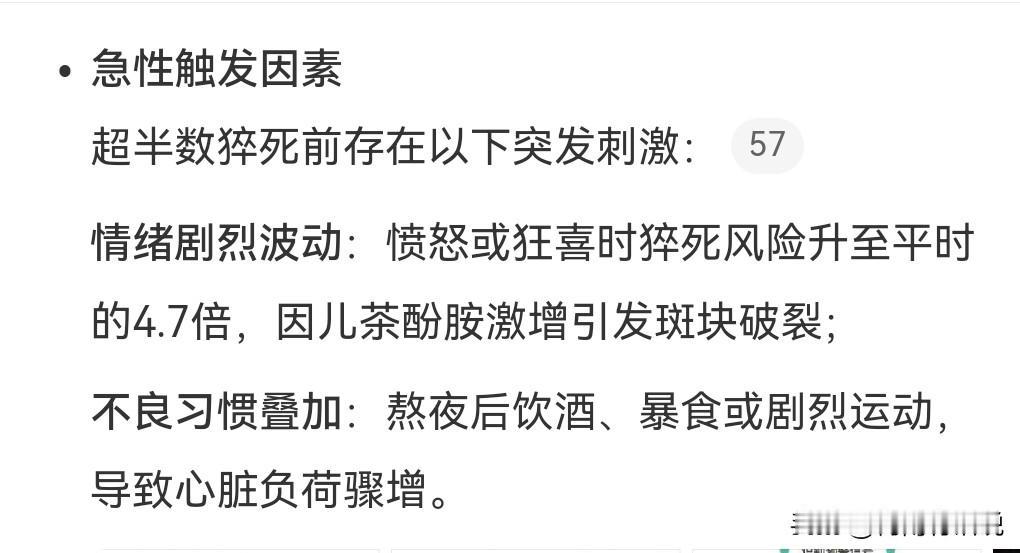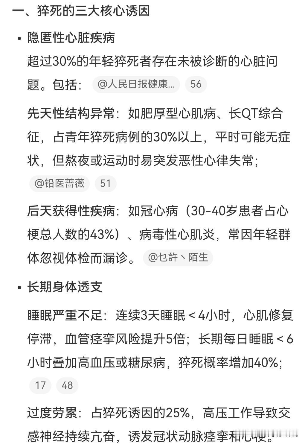 这个猝死真的是相当的可怕呀,防不胜防啊,总是听到年轻人猝死的消息。 我感觉那些猝死的很多情况下都是劳累导致的,没有注重休息。 近日有官媒就报道了,年轻人猝死大多由三个原因导致。 第1个原因就是压力过大,过度劳累。 第2个原因就是有心脏病却不自知。 第3个病毒性或爆发性心肌炎。 人要有一个工作,但是工作强度不能太大。 工作强度太大,长时间休息不好,那会大大增加猝死的风险。