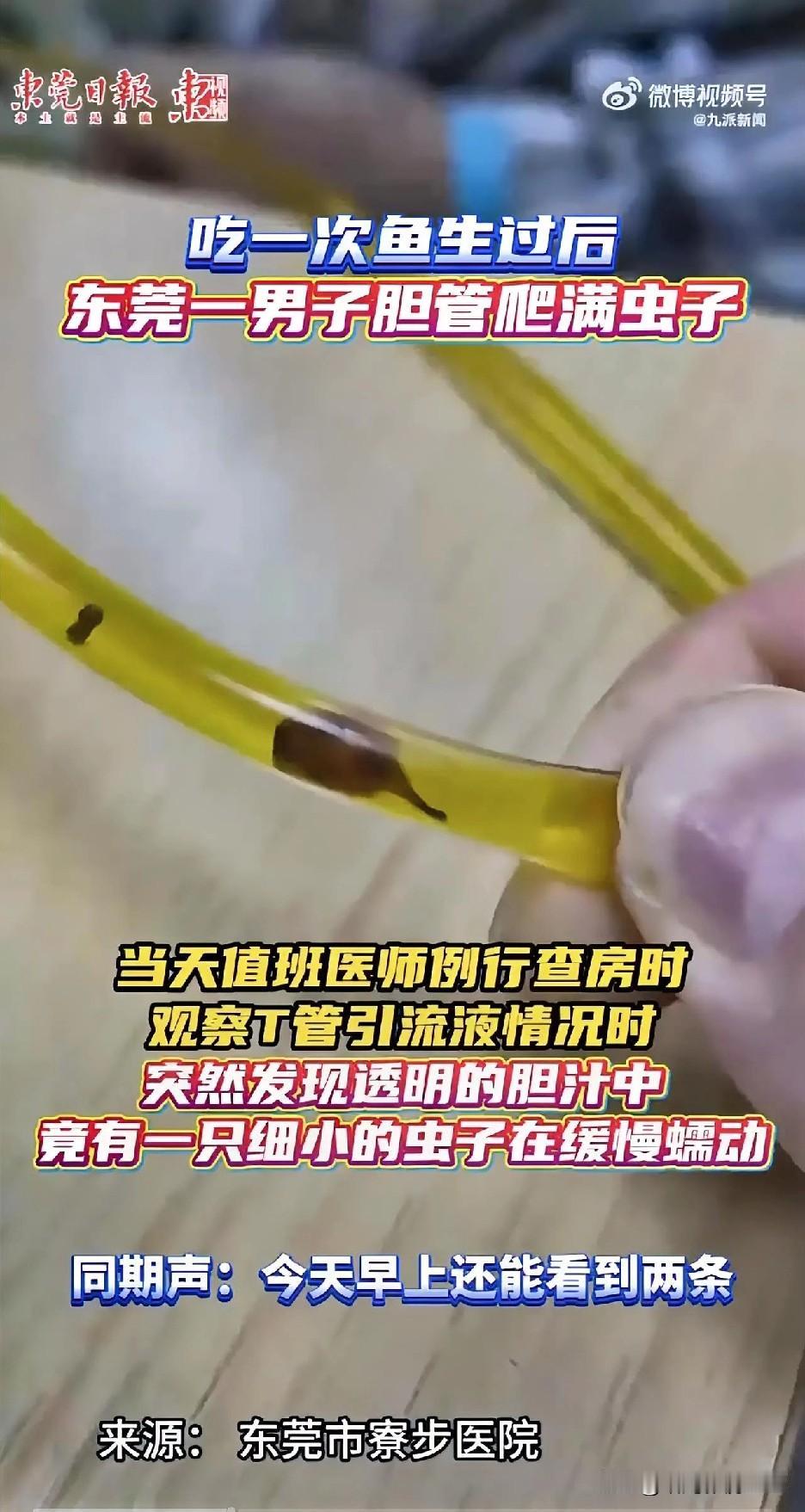 太可怕了…吓出一身冷汗!男子贪吃鱼生,胆管里爬满虫子,医生看了都咋舌 这事儿看完再也不敢随便吃鱼生了!广东一位大哥平时就好这口,总觉得鱼生新鲜爽口,不管是朋友聚餐还是自己解馋,都得点上几盘,蘸点芥末、喝口白酒就觉得能杀菌,从来没把寄生虫的事儿放心上。 结果最近这大哥不对劲了,总莫名肚子痛,皮肤还越来越黄,吃不下饭没力气,实在扛不住去医院检查。CT片一出来,医生都倒吸凉气。他的胆管里密密麻麻爬满了肝吸虫,有的还在蠕动,把胆管堵得严严实实! 手术时医生费了好大劲才把虫子清理干净,光肉眼可见的就有几十条,想想都头皮发麻!医生说,这都是长期吃生鱼片作的,别迷信芥末、白酒能杀虫,肝吸虫卵耐高温还耐酒精,根本杀不死,一旦进入人体就扎根胆管,啃食肝脏,时间长了还可能诱发肝硬化、癌症。 很多人觉得偶尔吃一次没事,可寄生虫这东西就不怕一万就怕万一!新鲜劲儿是过了,遭罪的可是自己的身体。咱老百姓吃东西,安全永远比口感重要,别为了图一时痛快,给健康埋隐患。 你平时爱吃鱼生吗?看完这事儿还敢吃吗?快来评论区说说你的看法!