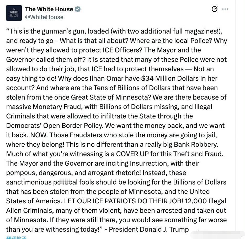 护士被多名ICE跪压近距离补枪射杀,特朗普却发长文及手枪照片为ICE辩护。明尼阿波利斯退伍军人事务部医院ICU注册护士,明尼苏达大学2011届生物学士,37岁的美国合法公民普雷蒂。 1月24日 09:05(CST):普雷蒂在26街与尼科莱菜特大道交叉口被边境巡逻局人员枪击,当场死亡。 国土安全部(DHS)发布声 明,称普雷蒂持9毫米手枪接近执法人员,执法人员试图夺枪时遭遇暴力反抗, 自卫开枪。承认普雷蒂合法持枪+隐蔽携枪许可,现场缴获手枪与弹匣。 路人视频,普雷蒂持手机拍摄,试图帮助被推倒的抗议者;多段视频无持枪画面。普雷蒂被7名执法人员跪压制服,倒地后遭补枪;无明显反抗动作。承认合法持枪,但强调未在现场拿出; 质疑枪支是否为事后放置。目击者(儿科医生)宣誓证词指出, 执法人员延误CPR,仅“清点枪伤”;现场无及时救生措施。 州政府起诉联邦“篡改/销毁证据”; 涉事人员未戴执法记录仪;州调查被阻挠, 要求独立调查。 特朗普总统的长篇声明为ICE辩护,附带一张手枪照片(枪放在汽车座椅上,旁边有弹匣和充电线,看起来像是随意摆放或事后拍摄)。