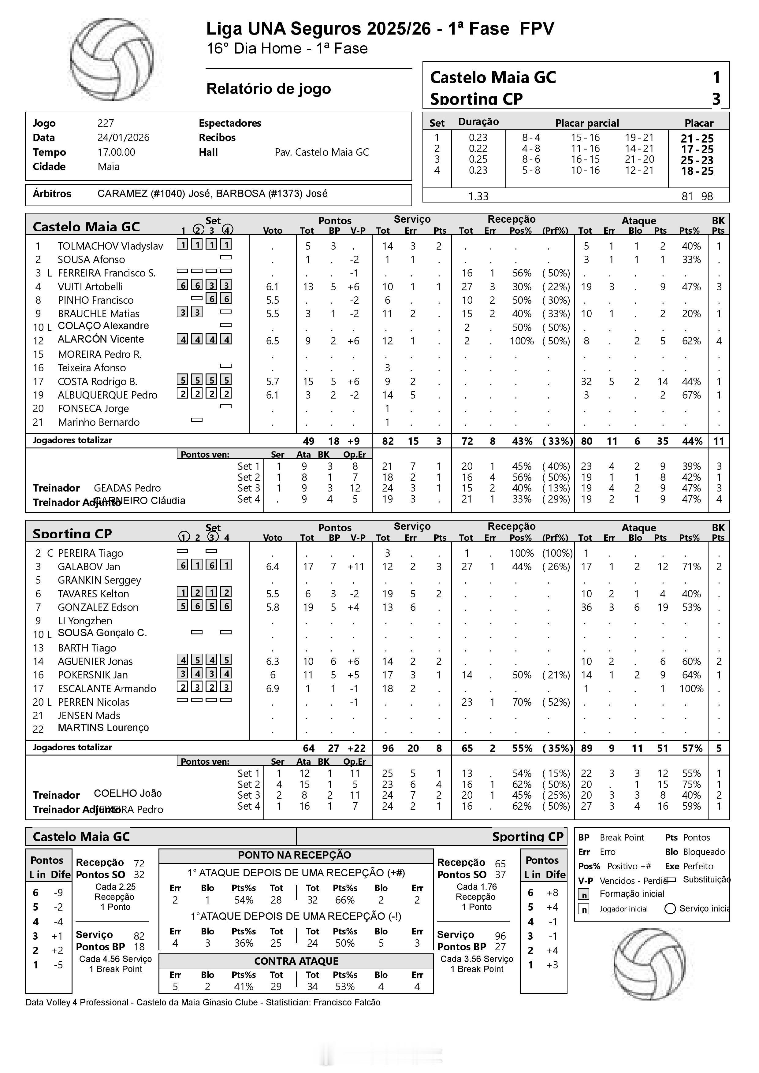 【李咏臻未上场 里斯本竞技客场3比1马亚城堡】北京时间25日凌晨,2025-2026葡萄牙男排联赛 常规赛第16轮,里斯本竞技在客场以3-1(25-21, 25-17, 23-25, 25-18)力克马亚城堡,收获第十五场胜利,继续领跑积分榜。中国外援李咏臻未上场。冈萨雷斯19分,加拉波夫17分,波克斯尼克11分,阿格尼尔10分;B·科斯塔15分,阿托·维蒂13分,阿拉松9分(拦4)。