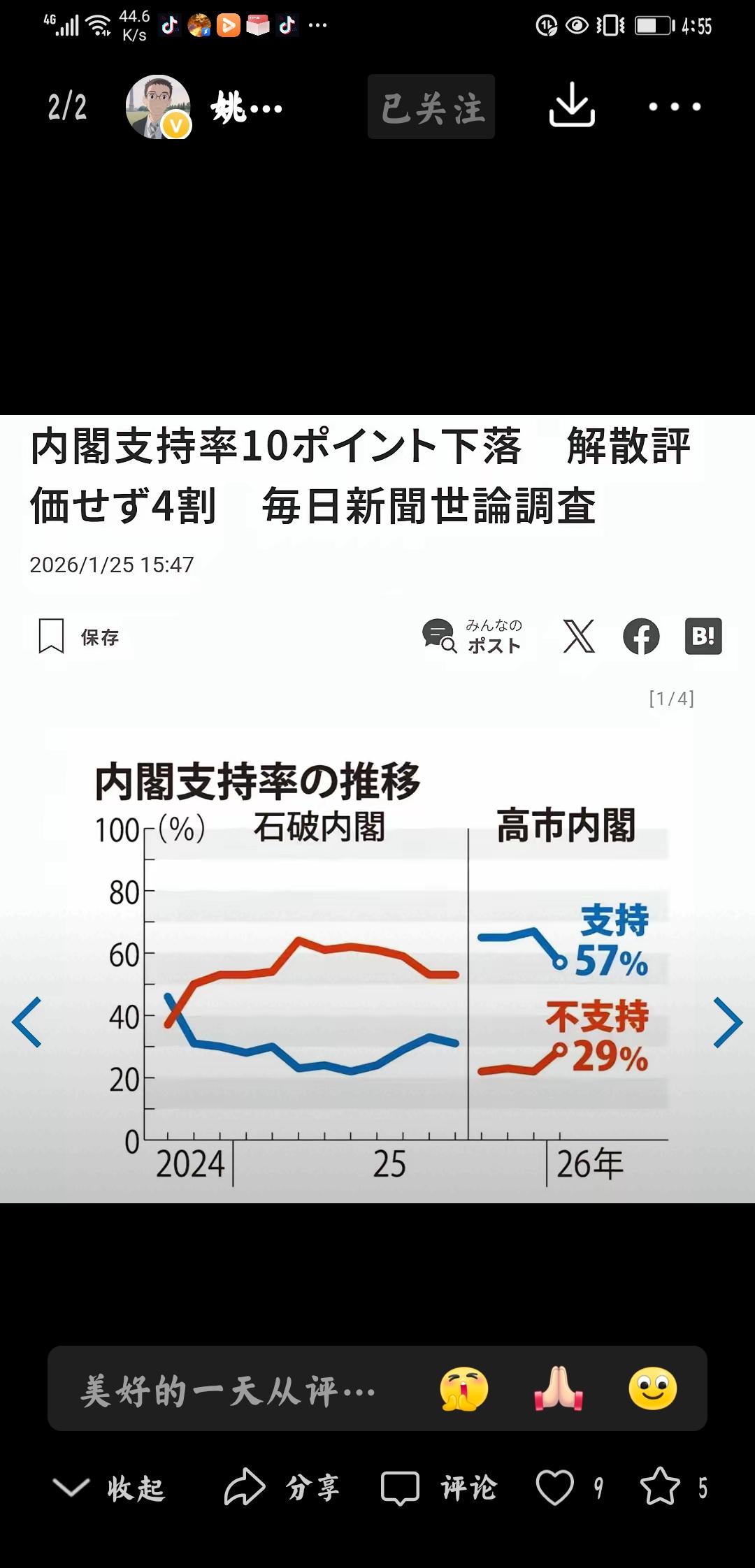 根据1月25日《每日新闻》,最新的民意调查,日本当前女执政者的支持率,出现了上任以来最大幅度的下降,目前来到了57%。 个人认为:日本当前女执政者以为放弃出席达沃斯论坛,重点维护国内支持者人群,就自我感觉大选,胜券在握了。 还是那句老话:“恶意煽动民心,光顾着喊口号,是不能持久。” 因为饿肚子的危险程度远远胜过“精神毒品”造成的自嗨。 日本民众的内心,就像日本的债市,汇市一样,冰冰凉,透心凉。