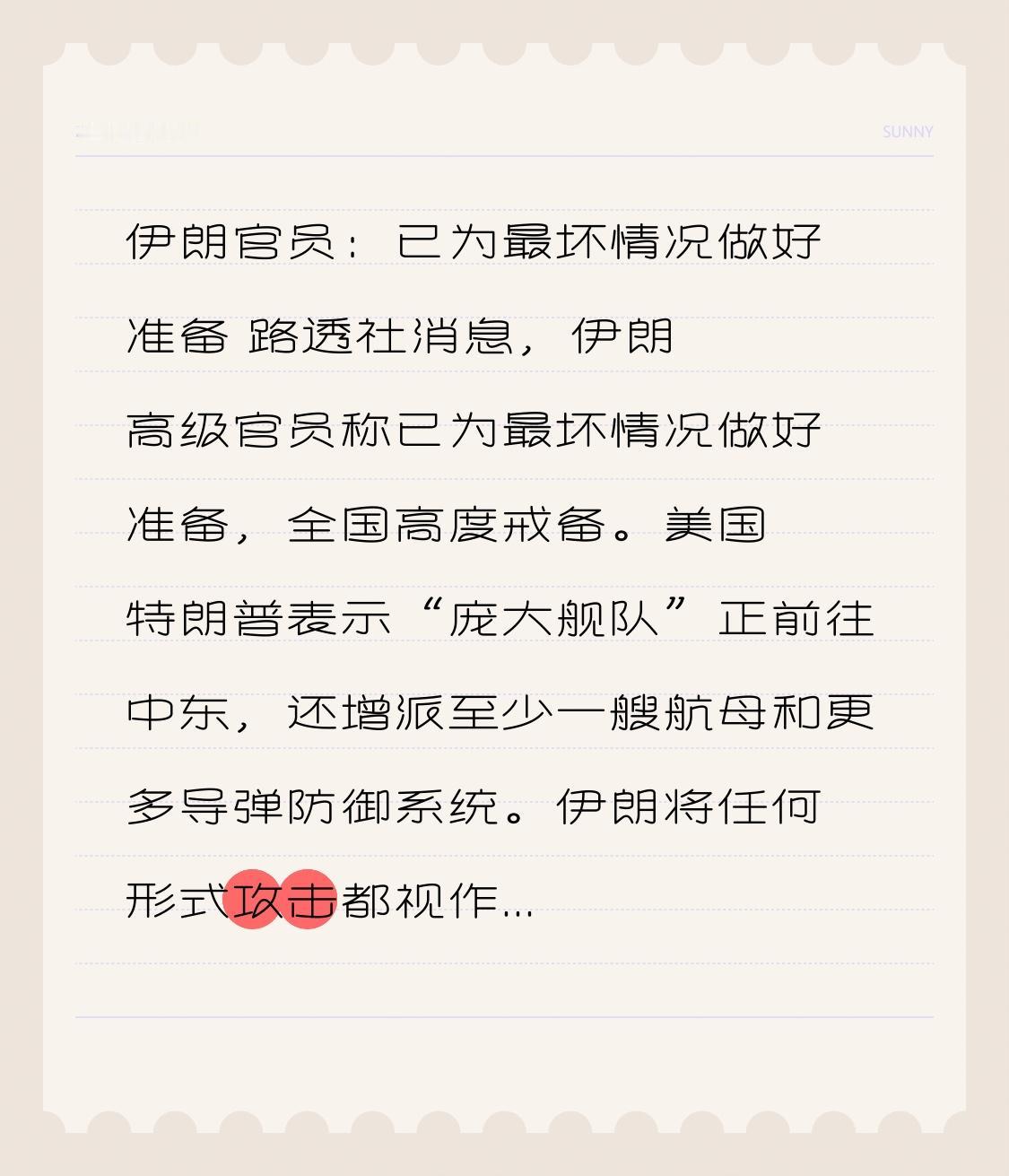 伊朗官员:已为最坏情况做好准备 路透社消息,伊朗高级官员称已为最坏情况做好准备,全国高度戒备。美国特朗普表示“庞大舰队”正前往中东,还增派至少一艘航母和更多导弹防御系统。 伊朗将任何形式攻击都视作“全面战争”,会最强硬回应。这种态度很刚,毕竟国家安全面前容不得半点妥协。美国频繁军事动作,无疑加剧紧张局势。过去美军增兵多为防御,但去年6月还曾对伊朗核计划有过袭击。伊朗如此表态也是为捍卫主权,只是这剑拔弩张的态势,真让人担忧会擦枪走火。