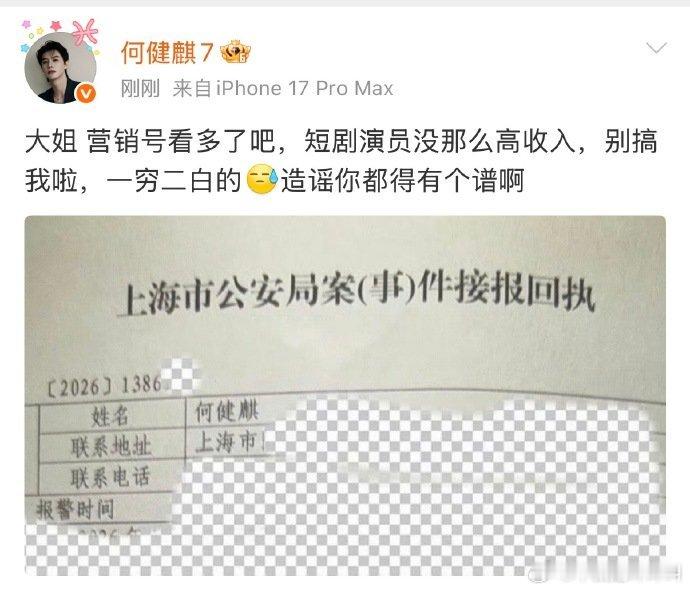 何健麒:“短剧演员没那么高收入,别搞我啦,一穷二白的,造谣你都得有个谱啊。”前女