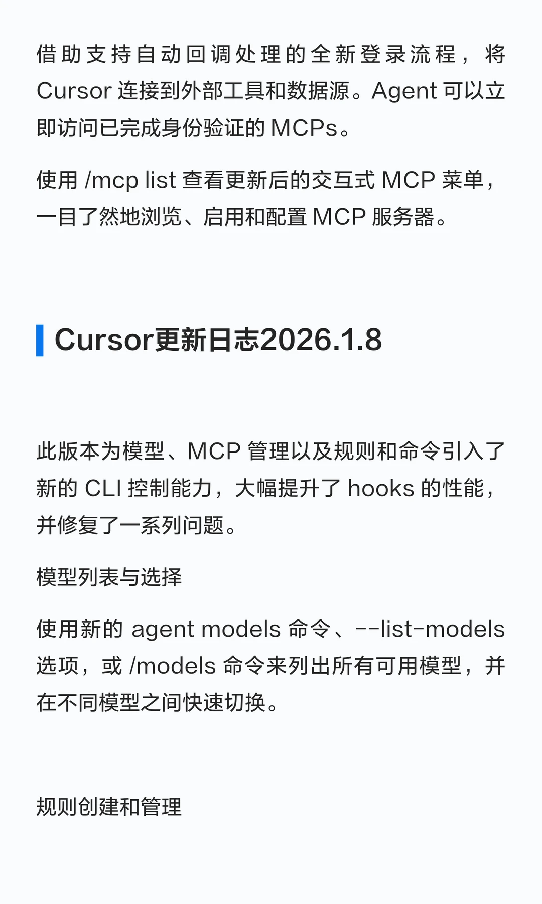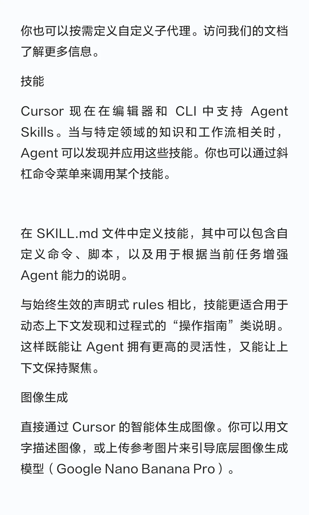 Cursor 现在在编辑器和 CLI 中支持 Agent Skills。当与特定领域的知识和工作流相关时,Agent 可以发现并应用这些技能。你也可以通过斜杠命令菜单来调用某个技能。