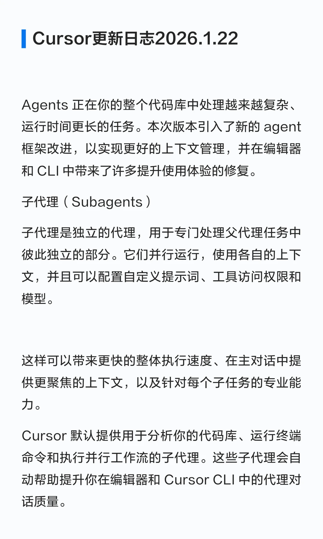 Cursor 默认提供用于分析你的代码库、运行终端命令和执行并行工作流的子代理。这些子代理会自动帮助提升你在编辑器和 Cursor CLI 中的代理对话质量。