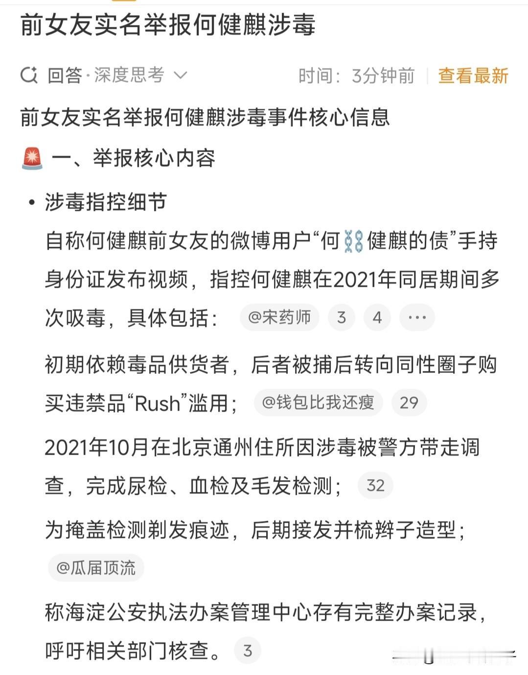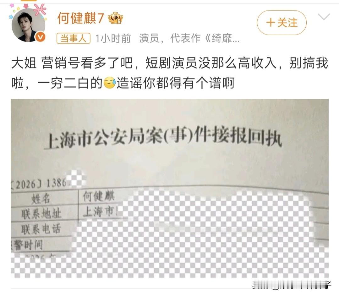 演员何健麒遭实名举报涉毒,本人发文回应,并晒出案件接报回执单! 1月25日, 深夜,短剧男演员何健麒登上热搜,然而,这一次并不是因为帅气的外形和演技,而是遭实名举报涉毒。 事情的起因,一位自称何健麒前女友的网友,晒出一段视频,手拿身份证,举报男方曾因涉毒被带走调查,并表示两人曾同居,还说出了具体年份。 消息一出。何健麒的粉丝坐不住了,纷纷表示担心,毕竟,这可不是小事,如果爆料属实,估计演艺事业就结束了。 随后,艺人工作室发布声明,称爆料内容纯属捏造事实,并已经报案。 何健麒本人也在社交平台发文辟谣,并晒出接报案回执单。 咱就说,艺人方面辟谣如此有底气,看来应该没什么事。 关键是,爆料者实名举报,如果真的造谣,胆子未免太大了。 既然何健麒已经辟谣,粉丝总算可以放心了,如此看来,网上爆料未必可信,希望大家理性吃瓜。
