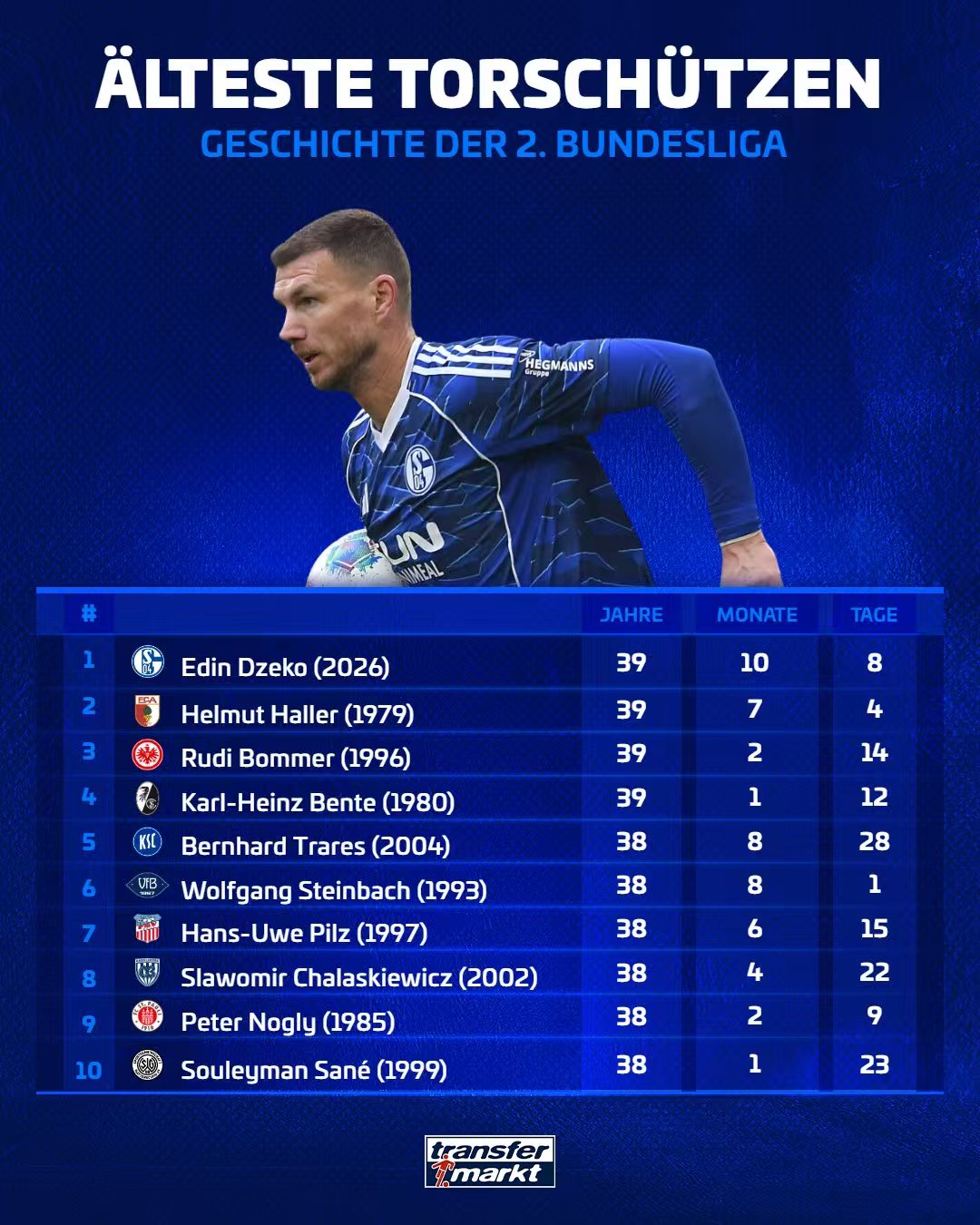 虎扑01月25日讯在沙尔克04对阵凯泽斯劳滕的德乙比赛中,刚刚加盟的埃丁-哲科完成了自己的球队首秀,并在第87分钟头球破门,以39岁10个月8天的年龄,成为德乙历史上最年长的进球者,一举刷新了尘封47年的纪录。