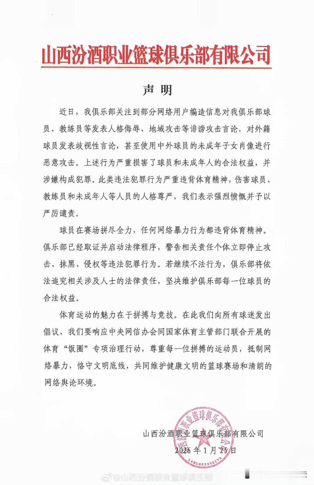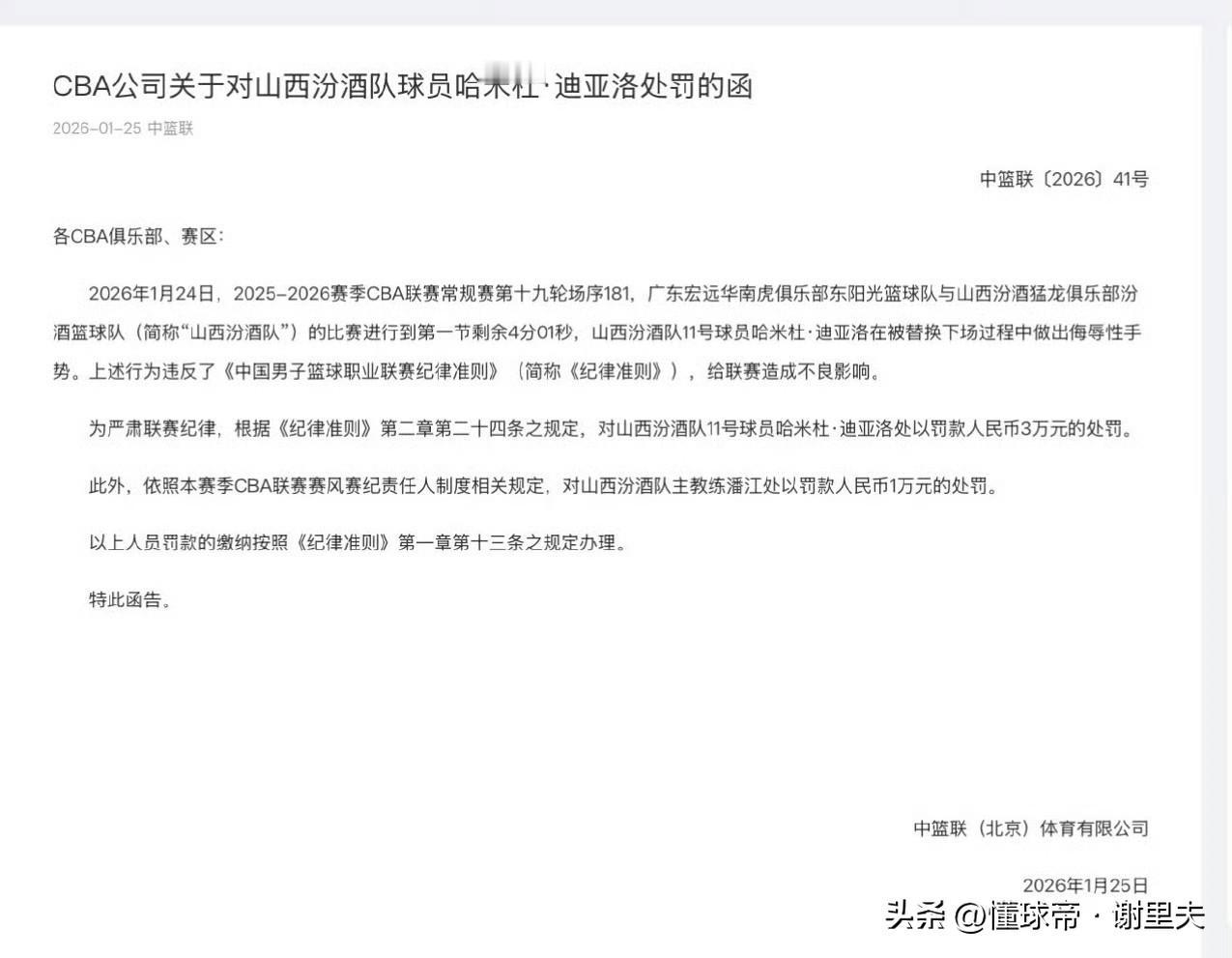 还是山西男篮有骨气!cba刚下发对迪亚洛和潘江罚款通知,时隔4小时,山西队发文谴责网络暴力,远离体育饭圈,恕我直言,作为山西老铁的粉丝,我挺赞成山西俱乐部,甚至希望能追责部分相关责任人进行追责,以儆效尤。可以说山西俱乐部反应很迅速,不能让自己球员被针对还默默忍受罚款,球场处罚接受,场外网暴绝对不行!