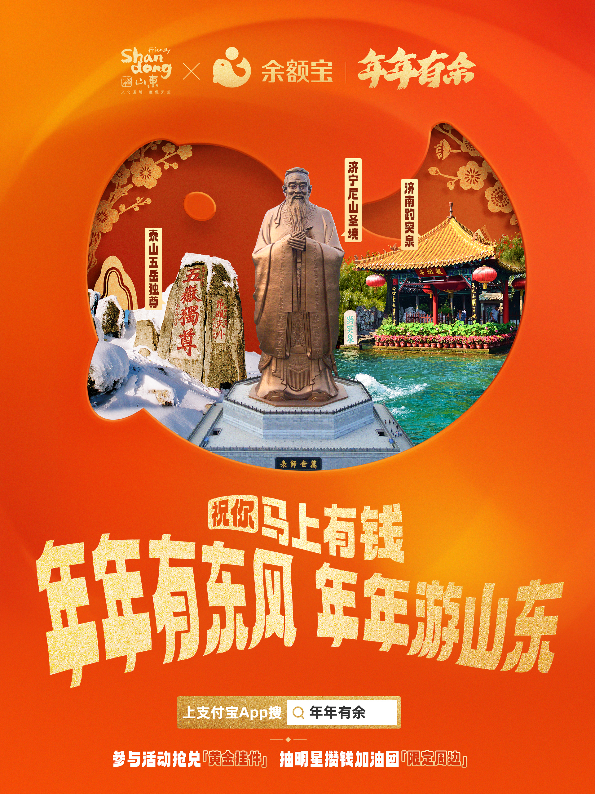 余额宝刷屏式年年有余祝福接爽了山东人火速赶来支援了!听说有趣的人新年祝福都用名字送?那俺们山东的“马上有钱,年年有东风”够不够有梗?不够咱还有,各种景点都能送个新祝福,还不快来山东接各种马年祝福!对了,现在上zfb搜“年年有余”参与活动,每天10:00/16:00都可以抢兑黄金挂件,明星攒钱团的限定周边也有机会获得哦~