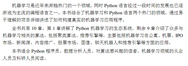 本书适合Python程序员、数据分析人员、对算法感兴趣的读者、机器学习领域的从业人员及科研人员阅读。