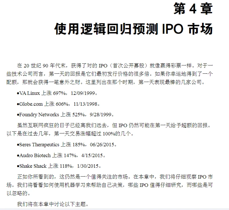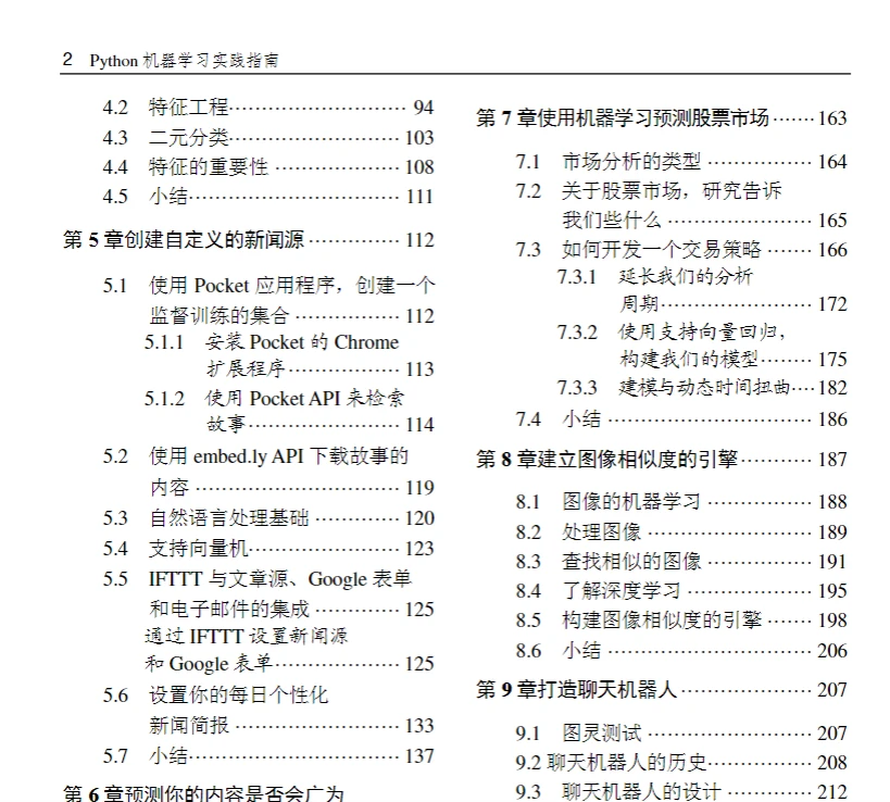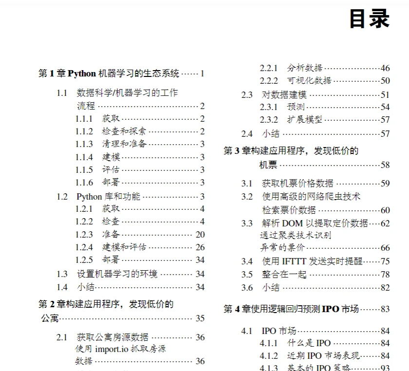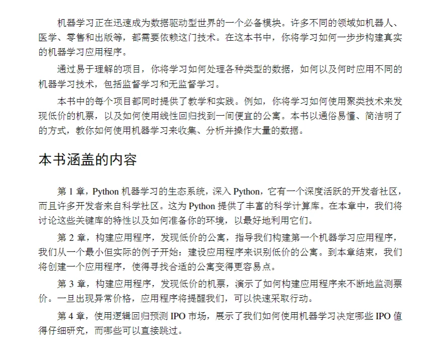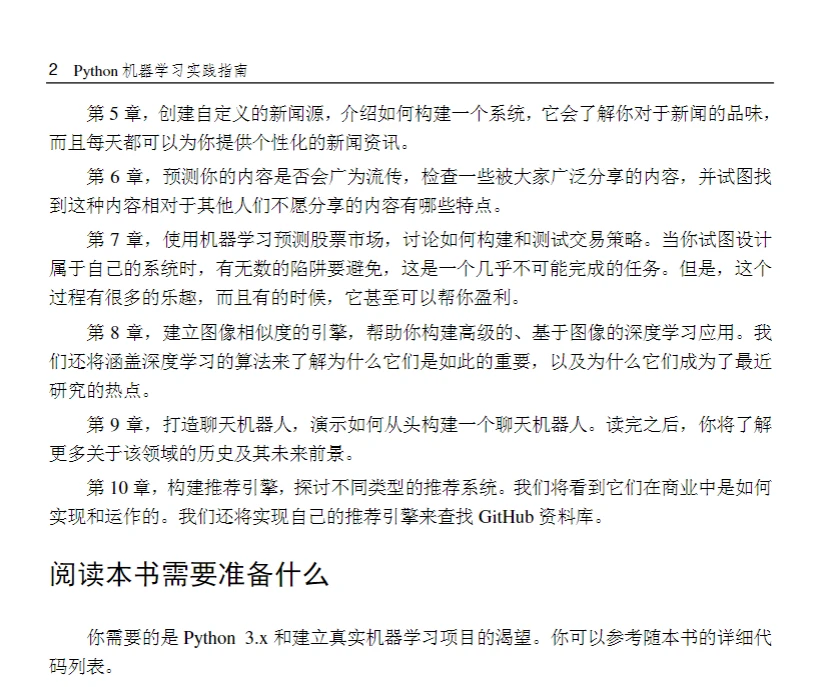 全书共有10章。第1章讲解了Python机器学习的生态系统,剩余9章介绍了众多与机器学习相关的算法,包括聚类算法、推荐引擎等,主要包括机器学习在公寓、机票、IPO市场、新闻源、内容推广、股票市场、图像、聊天机器人和推荐引擎等方面的应用。