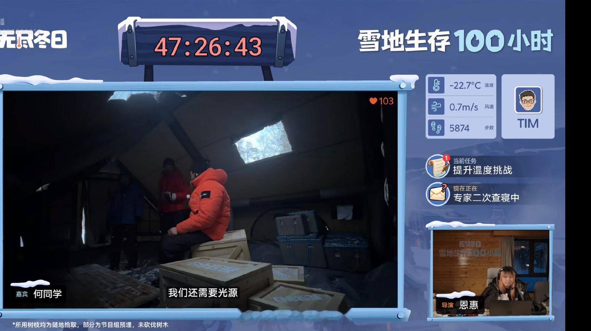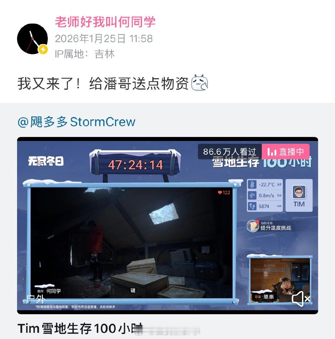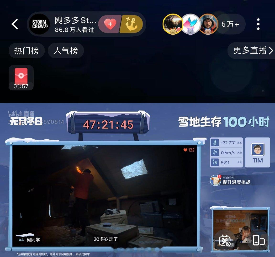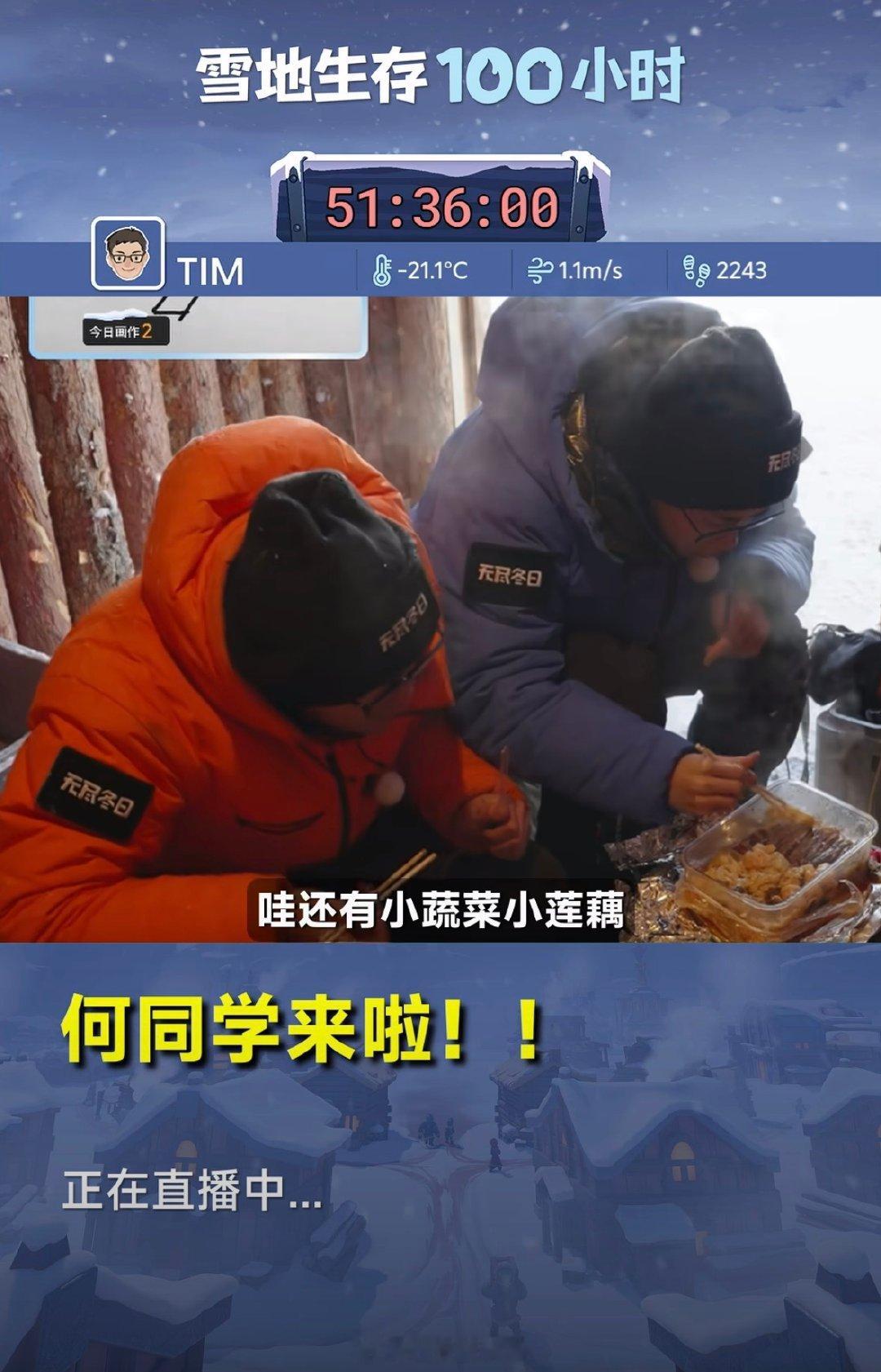 【影视飓风TIM雪地生存100小时已过半】何同学探望TIM1月25日,影视飓风TIM100小时雪地生存还剩不到47.5小时,直播间超5万人在线观看TIM生存挑战直播。下午,探望TIM,两人一起吃麻辣烫,大赞麻辣烫口味“夯爆了”。