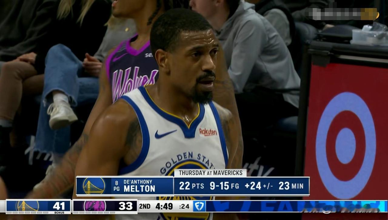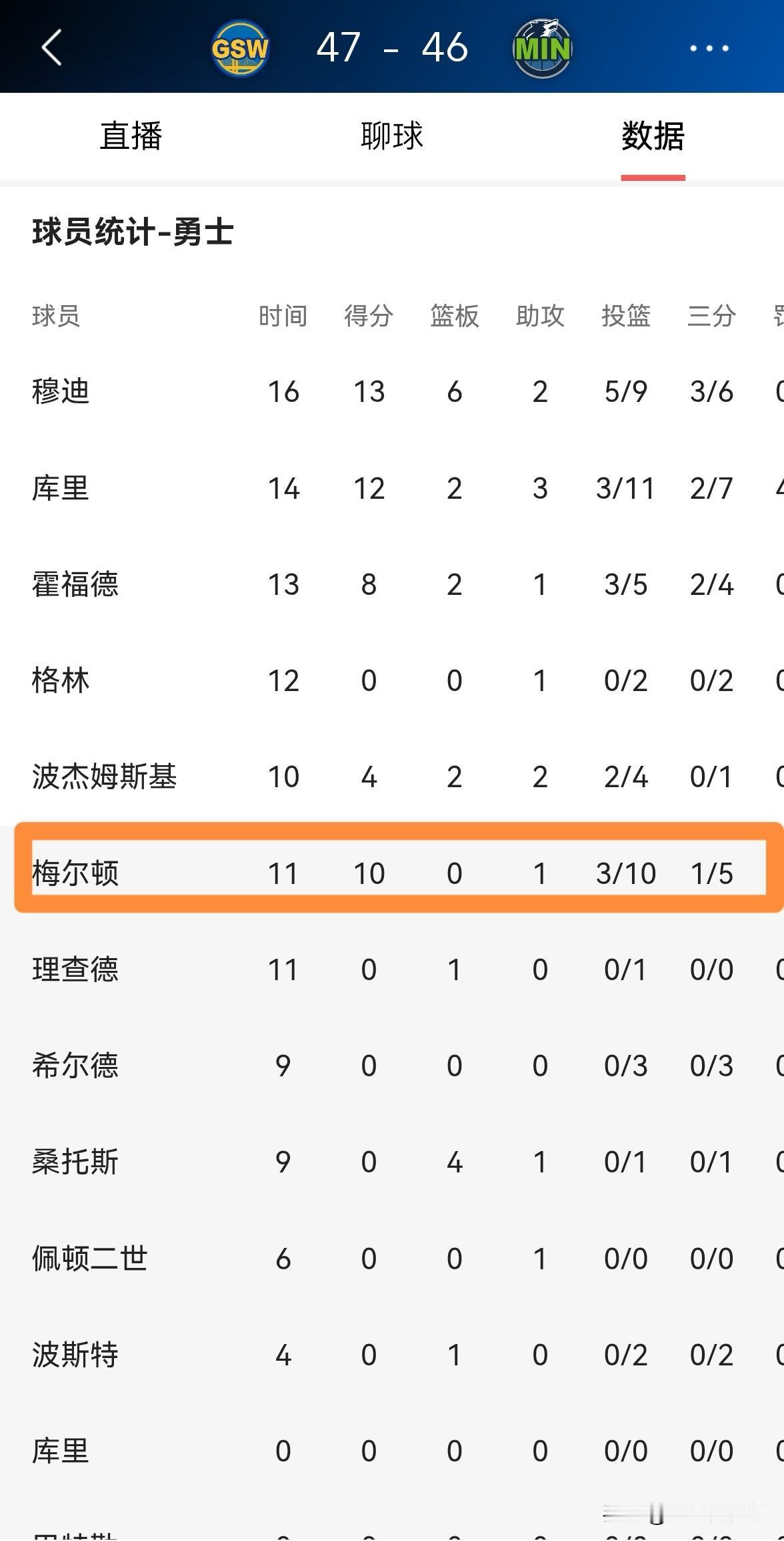 勇士大将梅尔顿真是球队的替补之神!在今天勇士客场挑战森林狼的比赛中,目前双方半场战罢,勇士以47:46领先对手1分。在前两节比赛中,尽管梅尔顿的进攻效率不高,但是他却是球队替补阵容中唯一得分的球员。 在上半场比赛中,梅尔顿替补出战11分钟,投篮10中3,其中三分球5中1、罚球3中3得到10分,还有1助攻,他的场上正负值为-3。
