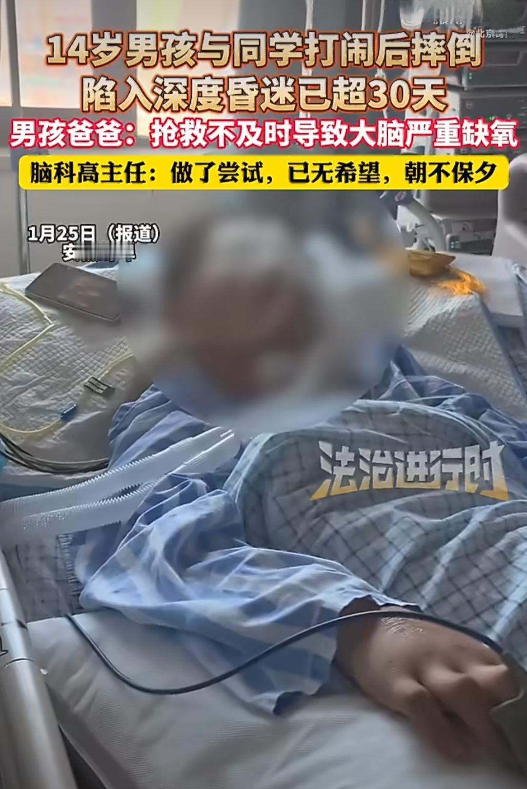 安徽蚌埠这起14岁男孩的遭遇,真的让人心里揪得慌,好好的孩子就因为一场课间打闹,现在已经深度昏迷超过30天,能不能醒过来都还是未知数。事情发生在学校里,当时这个14岁的男孩正和同学在校园里嬉闹,玩得好好的,不知道怎么就被同学绊了一下,一下子失去平衡摔倒在地,后脑勺重重磕在了地上。旁边的同学和老师发现后赶紧围了过来,这时候孩子已经没了意识,不管怎么叫都没反应,大家一下子就慌了神。有人急着救人,赶紧给孩子做了心肺复苏,可谁也没想到,这急救操作可能并不规范,全程都没配合人工呼吸,只是一个劲地按压,根本没法给孩子的大脑提供足够的氧气。男孩的父亲后来接受采访时说,正是因为摔倒后的抢救不及时、不规范,才导致孩子大脑严重缺氧,这也是孩子一直醒不过来的关键原因。孩子被紧急送到蚌埠医科大学第一附属医院后,就直接进了ICU,医生下了病危通知书,这一躺就是三十多天,期间一直处于深度昏迷状态,完全没有自主意识,也没法自己呼吸,全靠医疗器械维持着生命。为了能让孩子有一线生机,父母四处求医,花光了家里所有的积蓄,还卖掉了唯一的房子,每天上万的治疗费像流水一样花出去,可孩子的情况始终没有好转。后来他们特意联系到了上海的脑科高主任,高主任听说孩子的情况后,特意放弃休息连夜赶过来无偿会诊,可检查结果却让人绝望。高主任仔细看了孩子的CT片,又全面评估了脑部情况,还尝试了补液刺激等方法,最后无奈地告诉家长,孩子的脑部损伤已经不可逆了,颅内大血管都没有显影,而且还出现了脚部发黑坏死、感染指标超标的情况,各项指标都符合脑死亡的诊断标准,已经没有任何生还的希望,现在只能靠仪器维持,情况可以说是朝不保夕。看着病床上插满管子、毫无生气的蚌埠这起14岁男孩的遭遇,真的让人心里揪得慌,好好的孩子就因为一场课间打闹,现在已经深度昏迷超过30天,能不能醒过来都还是未知数。事情发生在学校里,当时这个14岁的男孩正和同学在校园里嬉闹,玩得好好的,不知道怎么就被同学绊了一下,一下子失去平衡摔倒在地,后脑勺重重磕在了地上。旁边的同学和老师发现后赶紧围了过来,这时候孩子已经没了意识,不管怎么叫都没反应,大家一下子就慌了神。有人急着救人,赶紧给孩子做了心肺复苏,可谁也没想到,这急救操作可能并不规范,全程都没配合人工呼吸,只是一个劲地按压,根本没法给孩子的大脑提供足够的氧气。男孩的父亲后来接受采访时说,正是因为摔倒后的抢救不及时、不规范,才导致孩子大脑严重缺氧,这也是孩子一直醒不过来的关键原因。孩子被紧急送到蚌埠医科大学第一附属医院后,就直接进了ICU,医生下了病危通知书,这一躺就是三十多天,期间一直处于深度昏迷状态,完全没有自主意识,也没法自己呼吸,全靠医疗器械维持着生命。为了能让孩子有一线生机,父母四处求医,花光了家里所有的积蓄,还卖掉了唯一的房子,每天上万的治疗费像流水一样花出去,可孩子的情况始终没有好转。后来他们特意联系到了上海的脑科高主任,高主任听说孩子的情况后,特意放弃休息连夜赶过来无偿会诊,可检查结果却让人绝望。高主任仔细看了孩子的CT片,又全面评估了脑部情况,还尝试了补液刺激等方法,最后无奈地告诉家长,孩子的脑部损伤已经不可逆了,颅内大血管都没有显影,而且还出现了脚部发黑坏死、感染指标超标的情况,各项指标都符合脑死亡的诊断标准,已经没有任何生还的希望,现在只能靠仪器维持,情况可以说是朝不保夕。看着病床上插满管子、毫无生气的孩子,父母的心都碎了,可他们还是不愿意放弃,每天隔着ICU的玻璃呼唤孩子,同学们也录制了鼓励的视频,一遍遍地喊着他的名字,希望能有奇迹发生。其实这种校园打闹引发的意外,本来可能有避免的余地,就算摔倒了,如果现场有人懂得正确的急救方法,抓住大脑缺氧的黄金四分钟,规范地做心肺复苏,既按压又配合人工呼吸,说不定孩子就能有不一样的结局。而且这也提醒大家,不管是学校还是家长,都得重视校园安全和急救知识的普及,平时要多给孩子讲安全常识,让他们知道打闹要有分寸,同时也得教给老师和学生正确的急救方法,遇到意外时才能不慌不乱,正确处置。毕竟对未成年人来说,校园里的安全防护和应急处理,每一个环节都不能马虎,稍微疏忽一点,就可能酿成一辈子的遗憾。