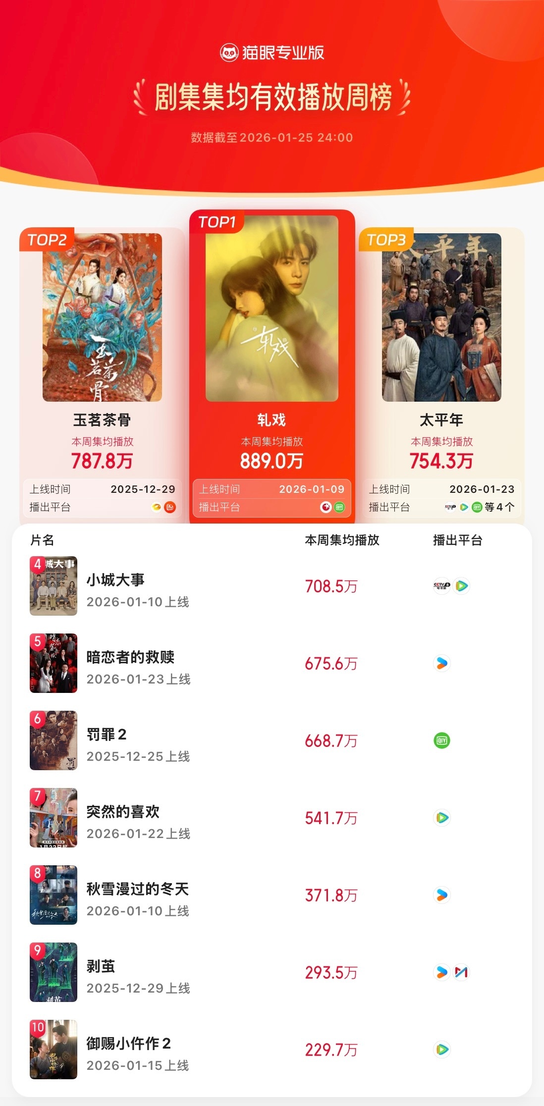 轧戏蝉联剧集集均有效播放周冠 据猫眼专业版数据,领衔主演电视剧《轧戏》蝉联猫眼剧集集均有效播放榜周冠!截至目前,全网累计有效播放量已超5.53亿。