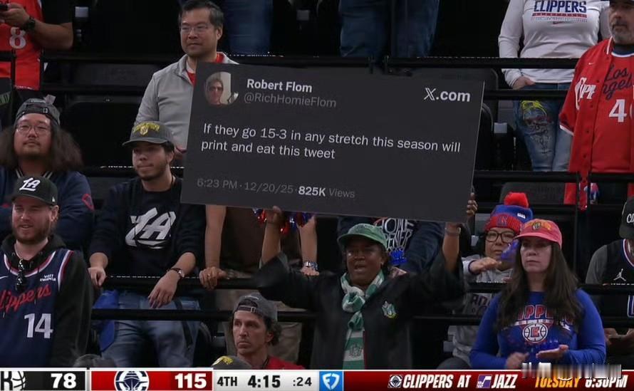 恭喜快船两连胜! 快船主场大胜篮网伦纳德28分祖巴茨11分10篮板,弥勒16分,哈登三节打卡19分! 目前快船21胜24负稳居西部第十,接下来开启三连客,先打爵士,在去丹佛高原,再打太阳,然后回主场打76人! 今天球场一位球迷举着牌子,上面写着如果快船本赛季在任何一段赛程中打出15胜3负的成绩,他就把这条推文打印出来并吃掉。 快船队 快船