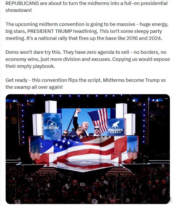 共和党即将把中期选举变成一场总统级的对决!即将到来的中期大会将会规模空前——能量满满、明星云集,由特朗普总统压轴登场。这可不是什么无聊的党内会议,而是一场能像2016年和2024年那样点燃基层激情的全国集会。民左党根本不敢尝试这样的做法。他们毫无可推销的议程——没有边境政策、没有经济成果,只有更多分裂和借口。要是模仿我们,只会暴露他们的空空如也的“剧本”。准备好吧——这次大会将彻底改写局面。中期选举又将变成特朗普对抗沼泽势力的大战!