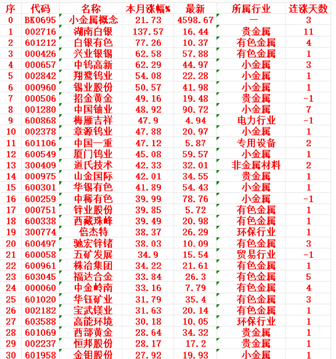 盘点小金属概念,自一月份以来涨幅最多的前30只个--股!小金属概念(板块指数):本月涨幅 +21.73%!声明:以下数据仅供学习研究参考,涉及个股不作任何的投资建议,仅供参考研究!湖南白银:本月涨幅 +137.57%,最新价 16.44元白银有色:本月涨幅 +77.26%,最新价 10.37元兴业银锡:本月涨幅 +62.58%,最新价 57.88元中钨高新:本月涨幅 +62.29%,最新价 44.97元翔鹭钨业:本月涨幅 +54.08%,最新价 22.28元锡业股份:本月涨幅 +50.57%,最新价 41.98元招金黄金:本月涨幅 +49.16%,最新价 19.48元中国铀业:本月涨幅 +48.92%,最新价 90.72元梅雁吉祥:本月涨幅 +47.90%,最新价 4.94元章源钨业:本月涨幅 +47.88%,最新价 20.97元