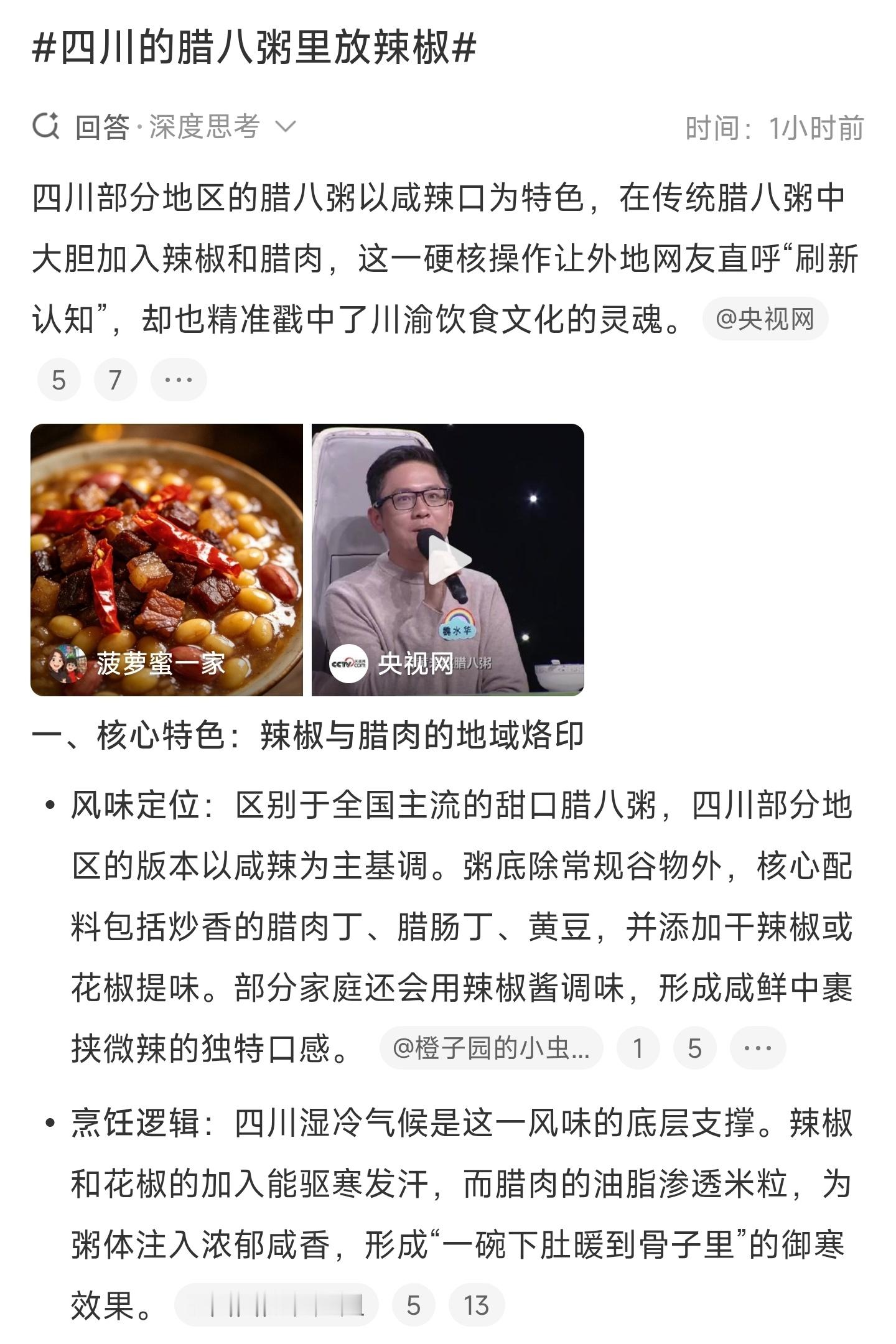 四川的腊八粥里放辣椒四川的朋友真是无辣不欢呀,广东的腊八粥应该会放陈皮吧。你们吃的腊八粥是甜的还是咸的?